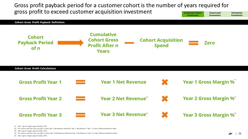 | 26 Gross profit payback period for a customer cohort is the number of years required for gross profit to exceed customer acquisition investment Cohort Gross Profit Calculations Gross Profit Year 1 Customer Cohort Economics State Level Economics Enterprise Economics Year 1 Net Revenue Year 1 Gross Margin % Gross Profit Year 2 Year 2 Net Revenue Year 2 Gross Margin % Gross Profit Year 3 Year 3 Net Revenue Year 3 Gross Margin % (1) Year 1 gross margin approximately 35%. (2) For cohorts with less than one year of data, Year 2 Net Revenue defined as Year 1 Net Revenue * Year 1 to Year 2 Revenue Rete nti on Rate. (3) Year 2 gross margin approximately 45%. (4) For cohorts with less than two years of data, Year 3 Net Revenue defined as Year 2 Net Revenue * Year 2 to Year 3 Revenue Ret ent ion Rate. (5) Year 3 gross margin approximately 50%. Cohort Gross Profit Payback Definition Cohort Acquisition Spend Cumulative Cohort Gross Profit After n Years Cohort Payback Period of n (1) (3) (5) (2) (4) Zero
