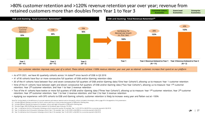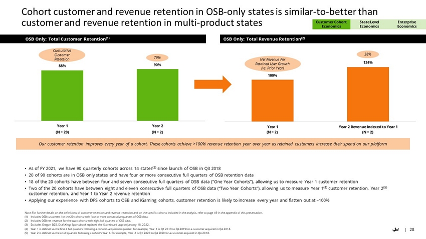 | 27 83% 88% 96% Year 1 Year 2 Year 3 100% 122% 143% Year 1 Year 2 Revenue Indexed to Year 1 Year 3 Revenue Indexed to Year 2 >80% customer retention and >120% revenue retention year over year; revenue from retained customers more than doubles from Year 1 to Year 3 • As of FY 2021, we have 90 quarterly cohorts across 14 states (3) since launch of OSB in Q3 2018 • 41 of 90 cohorts have four or more consecutive full quarters of OSB and/or iGaming retention data • 30 of the 41 cohorts have between four and seven consecutive full quarters of OSB and/or iGaming data (“One Year Cohorts”), a llo wing us to measure Year 1 customer retention • Nine of the 41 cohorts have between eight and eleven consecutive full quarters of OSB and/or iGaming data (“Two Year Cohorts” ), allowing us to measure Year 1 (4) customer retention, Year 2 (5) customer retention, and Year 1 to Year 2 revenue retention • Two of the 41 cohorts have twelve or more full quarters of OSB and/or iGaming data (“Three Year Cohorts”), allowing us to mea sur e Year 1 (4) customer retention, Year 2 (5) customer retention, Year 3 (6) customer retention, Year 1 to Year 2 revenue retention, and Year 2 to Year 3 revenue retention • Applying our experience with DFS cohorts to OSB and iGaming cohorts, customer retention is likely to increase every year and fla tten out at ~100% Note: For further details on the definitions of customer retention and revenue retention and on the specific cohorts included in the analysis, refer to page 49 in the appendix of this presentation. (1) Includes OSB and iGaming customers for the 41 cohorts with four or more consecutive quarters of OSB and/or iGaming data. (2) Includes OSB and iGaming net revenue for the eleven cohorts with eight full quarters of OSB and/or iGaming data. (3) Excludes Oregon B2B. DraftKings Sportsbook replaced the Scoreboard app on January 18, 2022. (4) Year 1 is defined as the first 4 full quarters following a cohort’s acquisition quarter. For example, Year 1 is Q1 2019 to Q4 20 19 for a customer acquired in Q4 2018. (5) Year 2 is defined as the 4 full quarters following a cohort’s Year 1. For example, Year 2 is Q1 2020 to Q4 2020 for a custome r a cquired in Q4 2018. (6) Year 3 is defined as the 4 full quarters following a cohort’s Year 2. For example, Year 3 is Q1 2021 to Q4 2021 for a custome r a cquired in Q4 2018. Our customer retention improves every year of a cohort. These cohorts achieve >100% revenue retention year over year as retai ned customers increase their spend on our platform (N = 41) (N = 11) OSB and iGaming: Total Customer Retention (1) OSB and iGaming: Total Revenue Retention (2) (N = 2) (N = 11) (N = 2) 39% Net Revenue Per Retained User Growth (vs. Prior Year) 49% Customer Cohort Economics State Level Economics Enterprise Economics Cumulative Customer Retention 73% 70%