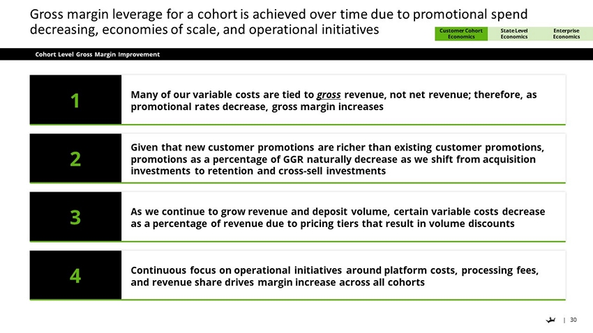 | 30 Gross margin leverage for a cohort is achieved over time due to promotional spend decreasing, economies of scale, and operational initiatives Customer Cohort Economics State Level Economics Enterprise Economics Cohort Level Gross Margin Improvement Many of our variable costs are tied to gross revenue, not net revenue; therefore, as promotional rates decrease, gross margin increases 1 Given that new customer promotions are richer than existing customer promotions, promotions as a percentage of GGR naturally decrease as we shift from acquisition investments to retention and cross - sell investments 2 As we continue to grow revenue and deposit volume, certain variable costs decrease as a percentage of revenue due to pricing tiers that result in volume discounts 3 Continuous focus on operational initiatives around platform costs, processing fees, and revenue share drives margin increase across all cohorts 4