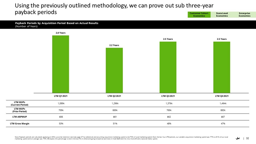 | 31 Our financial disclosures provide sufficient information to validate our payback periods on an LTM basis LTM MUPs Current Period LTM MUPs Prior Period LTM Acquired Paid New Actives LTM Acquired Paid New Actives Calculation Customer Acquisition Cost Calculation Player Retention Rate Months Played Per Average Player Customer Acquisition Cost Gross Profit Payback Periods Acquisition Marketing Spend Acquired Paid New Actives Customer Acquisition Cost Customer Cohort Economics State Level Economics Enterprise Economics Note: See page 46 for example calculations for each LTM period in FY 2021. (1) Over the last four LTM periods, our variable acquisition marketing spend was 77% to 81% of our total marketing spend and on a ver age 79%. We expect this percentage to be in the low 70s in 2022 and going forward as we invest in fixed S&M and mix into more ef ficient national media spend. (1) Approximate Payback Period (In Years) LTM ARPMUP Months Played Per Average Player LTM Gross Margin 12 Months Per Year
