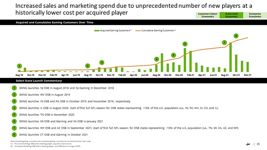 | 34 $21 $85 $153 $239 ($10) ($5) $8 $68 Launch Year (2018 A) Year 1 (2019 A) Year 2 (2020 A) Year 3 (2021 A) Net Revenue Contribution Profit NJ was highly profitable in its third full year; expect profitability to continue to ramp quickly in 2022 Note: Does not include DFS or retail businesses. Contribution profit is a non - GAAP metric that reflects gross profit less extern al marketing. NGR and Contribution Profit – New Jersey ($ in millions) Customer Cohort Economics State Level Economics Enterprise Economics Contribution Margin 28% (48)% (6)% 5%
