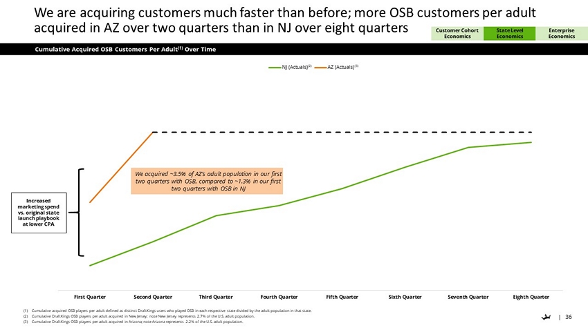 | 36 First Quarter Second Quarter Third Quarter Fourth Quarter Fifth Quarter Sixth Quarter Seventh Quarter Eighth Quarter NJ (Actuals) AZ (Actuals) We are acquiring customers much faster than before; more OSB customers per adult acquired in AZ over two quarters than in NJ over eight quarters Cumulative Acquired OSB Customers Per Adult (1) Over Time Customer Cohort Economics State Level Economics Enterprise Economics (1) Cumulative acquired OSB players per adult defined as distinct DraftKings users who played OSB in each respective state divide d b y the adult population in that state. (2) Cumulative DraftKings OSB players per adult acquired in New Jersey; note New Jersey represents 2.7% of the U.S. adult populat ion . (3) Cumulative DraftKings OSB players per adult acquired in Arizona; note Arizona represents 2.2% of the U.S. adult population. (2) (3) Increased marketing spend vs. original state launch playbook at lower CPA We acquired ~3.5% of AZ’s adult population in our first two quarters with OSB, compared to ~1.3% in our first two quarters with OSB in NJ