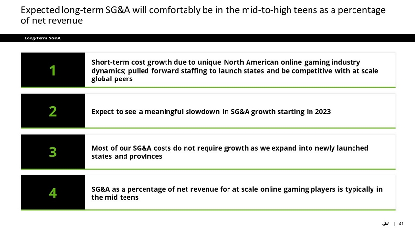 | 41 Expected long - term SG&A will comfortably be in the mid - to - high teens as a percentage of net revenue Long - Term SG&A Short - term cost growth due to unique North American online gaming industry dynamics; pulled forward staffing to launch states and be competitive with at scale global peers 1 Expect to see a meaningful slowdown in SG&A growth starting in 2023 2 Most of our SG&A costs do not require growth as we expand into newly launched states and provinces 3 SG&A as a percentage of net revenue for at scale online gaming players is typically in the mid teens 4