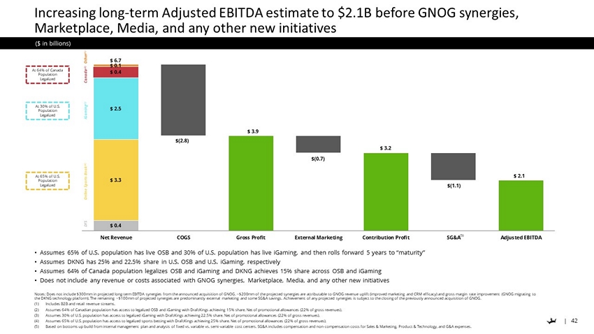 | 42 $ 0.4 $ 3.3 $ 2.5 $ 0.4 $ 0.1 $ 6.7 $ 3.9 $ 3.2 $ 2.1 Net Revenue COGS Gross Profit External Marketing Contribution Profit SG&A Adjusted EBITDA $(2.8) $(0.7) $(1.1) Increasing long - term Adjusted EBITDA estimate to $2.1B before GNOG synergies, Marketplace, Media, and any other new initiatives • Assumes 65% of U.S. population has live OSB and 30% of U.S. population has live iGaming, and then rolls forward 5 years to “m atu rity” • Assumes DKNG has 25% and 22.5% share in U.S. OSB and U.S. iGaming, respectively • Assumes 64% of Canada population legalizes OSB and iGaming and DKNG achieves 15% share across OSB and iGaming • Does not include any revenue or costs associated with GNOG synergies, Marketplace, Media, and any other new initiatives Notes: Does not include $300mm in projected long - term EBITDA synergies from the announced acquisition of GNOG. ~$200mm of the pr ojected synergies are attributable to GNOG revenue uplift (improved marketing and CRM efficacy) and gross margin rate improve men t (GNOG migrating to the DKNG technology platform). The remaining ~$100mm of projected synergies are predominantly external marketing and some SG& A s avings. Achievement of any projected synergies is subject to the closing of the previously announced acquisition of GNOG. (1) Includes B2B and retail revenue streams. (2) Assumes 64% of Canadian population has access to legalized OSB and iGaming with DraftKings achieving 15% share. Net of promot ion al allowances (22% of gross revenues). (3) Assumes 30% of U.S. population has access to legalized iGaming with DraftKings achieving 22.5% share. Net of promotional allo wan ces (22% of gross revenues). (4) Assumes 65% of U.S. population has access to legalized sports betting with DraftKings achieving 25% share. Net of promotional al lowances (22% of gross revenues). (5) Based on bottoms up build from internal management plan and analysis of fixed vs. variable vs. semi - variable cost centers. SG&A includes compensation and non - compensation costs for Sales & Marketing, Product & Technology, and G&A expenses. DFS Online Sports Book (4) iGaming (3) Other (1) At 30% of U.S. Population Legalized At 65% of U.S. Population Legalized (5) ($ in billions) Canada (2) At 64% of Canada Population Legalized