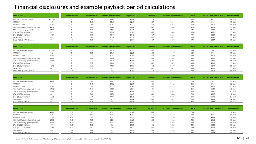 | 46 Financial disclosures and example payback period calculations Notes: Includes all B2C revenue from OSB, iGaming, DFS, and other. Implied new actives (k) = (12 / Months played) * New MUPs (k) . LTM Q4 2021 Months Played New MUPS (k) Implied New Actives (k) Implied CAC ($) ARPMUP ($) Revenue / New Active ($) GM% GP ($) / New Paid Active Payback Period B2C Net Revenue ($ in mm) $1,199 2 761 4,564 $161 $67 $134 47% $63 2.5 Years ARPMUP $67 3 761 3,043 $241 $67 $201 47% $95 2.5 Years Enterprise GM% 47% 4 761 2,282 $322 $67 $267 47% $127 2.5 Years All - in Adj. Marketing Spend ($ in mm) $929 5 761 1,826 $402 $67 $334 47% $159 2.5 Years 79% of Marketing Spend ($ in mm) $734 6 761 1,521 $482 $67 $401 47% $190 2.5 Years LTM Q4 2020 MUPs (k) 883 7 761 1,304 $563 $67 $468 47% $222 2.5 Years LTM Q4 2021 MUPs (k) 1,494 8 761 1,141 $643 $67 $535 47% $254 2.5 Years Net Adds (k) 611 9 761 1,014 $724 $67 $602 47% $286 2.5 Years Gross Adds @ 17% Churn (k) 761 10 761 913 $804 $67 $669 47% $317 2.5 Years LTM Q3 2021 Months Played New MUPS (k) Implied New Actives (k) Implied CAC ($) ARPMUP ($) Revenue / New Active ($) GM% GP ($) / New Paid Active Payback Period B2C Net Revenue ($ in mm) $1,031 2 737 4,424 $152 $62 $125 48% $60 2.5 Years ARPMUP $62 3 737 2,949 $228 $62 $187 48% $90 2.5 Years Enterprise GM% 48% 4 737 2,212 $304 $62 $250 48% $121 2.5 Years All - in Adj. Marketing Spend ($ in mm) $850 5 737 1,770 $379 $62 $312 48% $151 2.5 Years 79% of Marketing Spend ($ in mm) $672 6 737 1,475 $455 $62 $375 48% $181 2.5 Years LTM Q3 2020 MUPs (k) 769 7 737 1,264 $531 $62 $437 48% $211 2.5 Years LTM Q3 2021 MUPs (k) 1,376 8 737 1,106 $607 $62 $500 48% $241 2.5 Years Net Adds (k) 607 9 737 983 $683 $62 $562 48% $271 2.5 Years Gross Adds @ 17% Churn (k) 737 10 737 885 $759 $62 $624 48% $302 2.5 Years LTM Q2 2021 Months Played New MUPS (k) Implied New Actives (k) Implied CAC ($) ARPMUP ($) Revenue / New Active ($) GM% GP ($) / New Paid Active Payback Period B2C Net Revenue ($ in mm) $945 2 741 4,443 $134 $61 $122 51% $62 2.2 Years ARPMUP $61 3 741 2,962 $201 $61 $182 51% $93 2.2 Years Enterprise GM% 51% 4 741 2,222 $267 $61 $243 51% $124 2.2 Years All - in Adj. Marketing Spend ($ in mm) $752 5 741 1,777 $334 $61 $304 51% $155 2.2 Years 79% of Marketing Spend ($ in mm) $594 6 741 1,481 $401 $61 $365 51% $186 2.2 Years LTM Q2 2020 MUPs (k) 669 7 741 1,270 $468 $61 $426 51% $217 2.2 Years LTM Q2 2021 MUPs (k) 1,296 8 741 1,111 $535 $61 $486 51% $248 2.2 Years Net Adds (k) 627 9 741 987 $602 $61 $547 51% $279 2.2 Years Gross Adds @ 17% Churn (k) 741 10 741 889 $669 $61 $608 51% $310 2.2 Years LTM Q1 2021 Months Played New MUPS (k) Implied New Actives (k) Implied CAC ($) ARPMUP ($) Revenue / New Active ($) GM% GP ($) / New Paid Active Payback Period B2C Net Revenue ($ in mm) $731 2.0 500 3,002 $168 $56 $112 53% $59 2.8 Years ARPMUP $56 3.0 500 2,001 $252 $56 $168 53% $89 2.8 Years Enterprise GM% 53% 4.0 500 1,501 $336 $56 $224 53% $119 2.8 Years All - in Adj. Marketing Spend ($ in mm) $638 5.0 500 1,201 $420 $56 $280 53% $149 2.8 Years 79% of Marketing Spend ($ in mm) $504 6.0 500 1,001 $504 $56 $336 53% $178 2.8 Years LTM Q1 2020 MUPs (k) 709 7.0 500 858 $588 $56 $392 53% $208 2.8 Years LTM Q1 2021 MUPs (k) 1,089 8.0 500 750 $672 $56 $448 53% $238 2.8 Years Net Adds (k) 380 9.0 500 667 $756 $56 $504 53% $267 2.8 Years Gross Adds @ 17% Churn (k) 500 10.0 500 600 $840 $56 $560 53% $297 2.8 Years