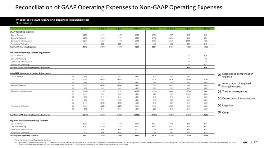 | 47 Reconciliation of GAAP Operating Expenses to Non - GAAP Operating Expenses FY 2020 to FY 2021 Operating Expenses Reconciliation ($ in millions) Stock - based compensation expense Amortization of acquired intangible assets Transaction expenses Depreciation & Amortization Litigation Other (a) (b) (c) (d) (e) (f) Note: Numbers may not foot due to rounding. (1) Pursuant to the principles of Article 11 of Regulation S - X, the transaction costs related to the Business Combination have been eliminated in calculating our Pro - Forma Operating Expenses in Proforma Adjusted EBITDA tables in our 10K for the twelve months e nded December 31, 2020. These costs were approximately $31mm for the year ended December 31, 2020 and are included in our GAAP Operating Expenses on thi s page. 31 - Dec - 21 30 - Sep - 21 30 - Jun - 21 31 - Mar - 21 31 - Dec - 20 30 - Sep - 20 30 - Jun - 20 31 - Mar - 20 GAAP Operating Expenses Cost of Revenue $253 $171 $187 $183 $159 $97 $47 $43 Sales and Marketing $278 $304 $171 $229 $192 $203 $46 $54 General and Administrative $241 $220 $199 $169 $173 $127 $107 (1) $39 (1) Product and Technology $70 $65 $63 $56 $66 $54 $31 $18 Total GAAP Operating Expenses $842 $759 $619 $637 $591 $481 $231 $155 Pro - Forma Operating Expense Adjustments Cost of Revenue $0 $0 $0 $0 $6 $25 Sales and Marketing $0 $0 $0 $0 $1 $4 General and Administrative $0 $0 $0 $0 $0 $9 $5 Product and Technology $0 $0 $0 $0 $0 $6 $12 Total Pro - Forma Operating Expense Adjustments $22 $46 Non - GAAP Operating Expense Adjustments Cost of Revenue (a) ($1) ($2) ($1) ($1) ($1) ($0) ($0) $0 (b) ($20) ($20) ($21) ($19) ($18) ($19) ($18) ($18) (d) ($9) ($7) ($7) ($7) ($6) ($6) ($4) ($4) Sales and Marketing (a) ($15) ($14) ($14) ($9) ($7) ($12) ($3) ($0) (d) ($0) ($0) ($0) ($0) ($0) ($0) ($0) ($0) General and Administrative (a) ($142) ($134) ($132) ($122) ($116) ($83) ($54) ($4) (c) ($10) ($4) ($8) ($3) ($2) ($4) ($25) (1) ($6) (1) (d) ($1) ($1) ($1) ($1) ($1) ($1) ($1) ($1) (e) ($1) ($5) ($4) ($1) ($1) ($2) ($2) ($1) (f) ($13) ($18) ($13) ($2) ($1) ($2) ($3) ($0) Product and Technology (a) ($26) ($26) ($25) ($20) ($25) ($22) ($8) ($0) (d) ($1) ($1) ($1) ($1) ($2) ($1) ($1) ($1) Total Non - GAAP Operating Expense Adjustments ($241) ($233) ($226) ($186) ($180) ($151) ($119) ($35) Adjusted Pro - Forma Operating Expenses Cost of Revenue $223 $142 $159 $157 $134 $72 $32 $47 Sales and Marketing $263 $289 $157 $220 $184 $191 $43 $57 General and Administrative $74 $58 $41 $41 $52 $36 $33 $33 Product and Technology $42 $38 $36 $34 $39 $31 $27 $28 Total Adjusted Operating Expenses $601 $526 $393 $452 $410 $330 $135 $165