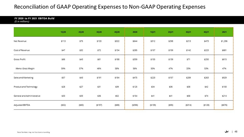 | 48 Reconciliation of GAAP Operating Expenses to Non - GAAP Operating Expenses FY 2020 to FY 2021 EBITDA Build ($ in millions) 1Q20 2Q20 3Q20 4Q20 2020 1Q21 2Q21 3Q21 4Q21 2021 Net Revenue $113 $75 $133 $322 $644 $312 $298 $213 $473 $1,296 Cost of Revenue $47 $32 $72 $134 $285 $157 $159 $142 $223 $681 Gross Profit $66 $43 $61 $188 $359 $155 $139 $71 $250 $615 Memo: Gross Margin 59% 57% 46% 58% 56% 50% 47% 33% 53% 47% Sales and Marketing $57 $43 $191 $184 $475 $220 $157 $289 $263 $929 Product and Technology $28 $27 $31 $39 $125 $34 $36 $38 $42 $150 General and Administrative $33 $33 $36 $52 $154 $41 $41 $58 $74 $214 Adjusted EBITDA ($52) ($60) ($197) ($88) ($396) ($139) ($95) ($314) ($128) ($676) Note: Numbers may not foot due to rounding.