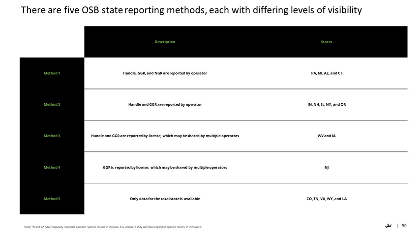 | 50 Description States Method 1 Handle, GGR, and NGR are reported by operator PA, MI, AZ, and CT Method 2 Handle and GGR are reported by operator IN, NH, IL, NY, and OR Method 3 Handle and GGR are reported by license, which may be shared by multiple operators WV and IA Method 4 GGR is reported by license, which may be shared by multiple operators NJ Method 5 Only data for the total state is available CO, TN, VA, WY, and LA There are five OSB state reporting methods, each with differing levels of visibility Note: TN and VA have irregularly reported operator - specific results in the past. It is unclear if they will report operator - spec ific results in the future.