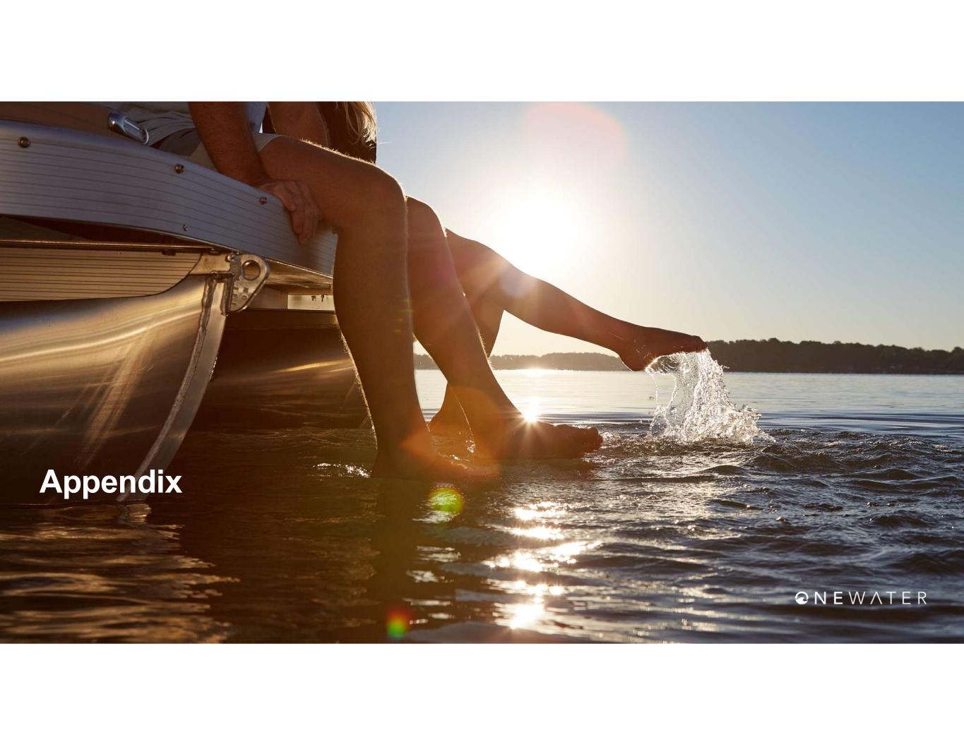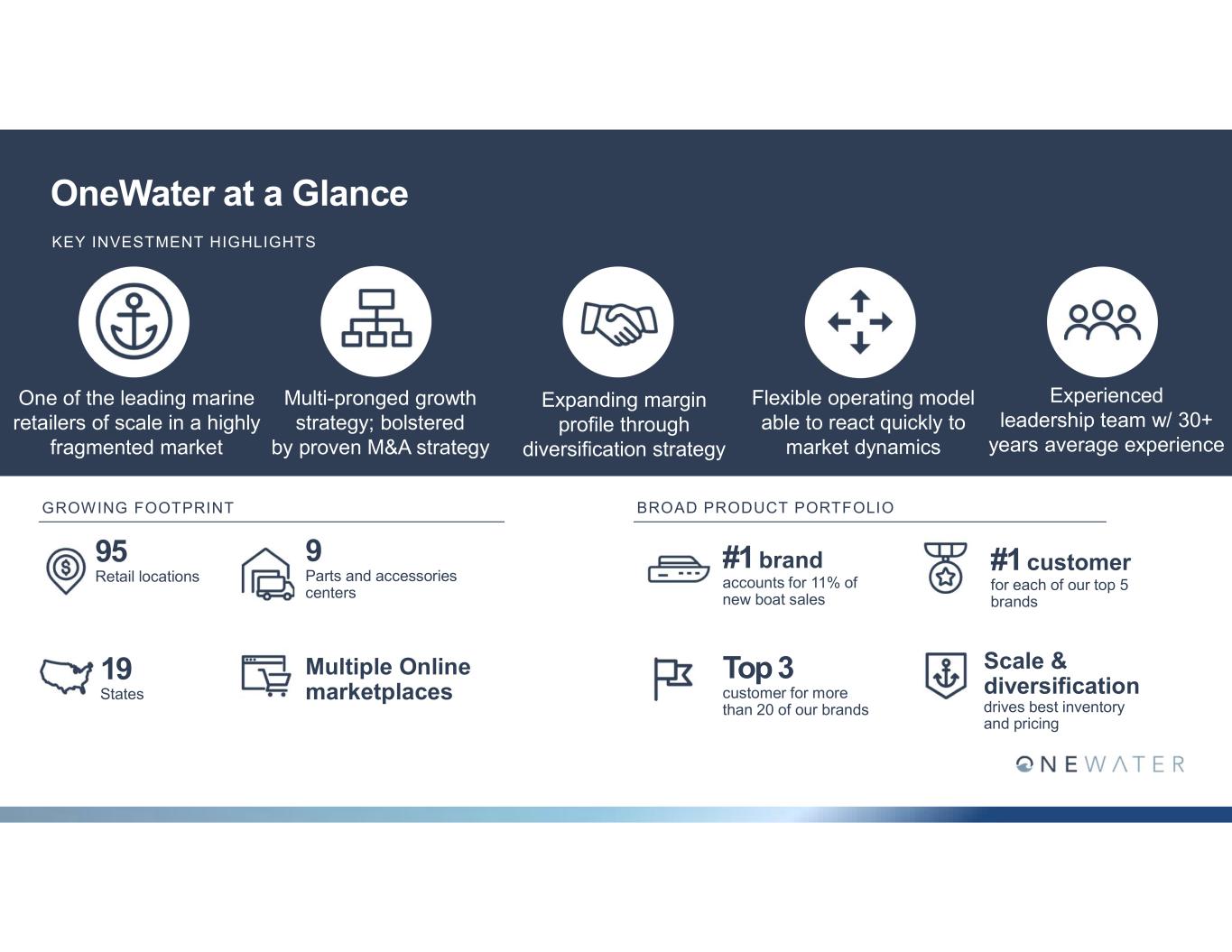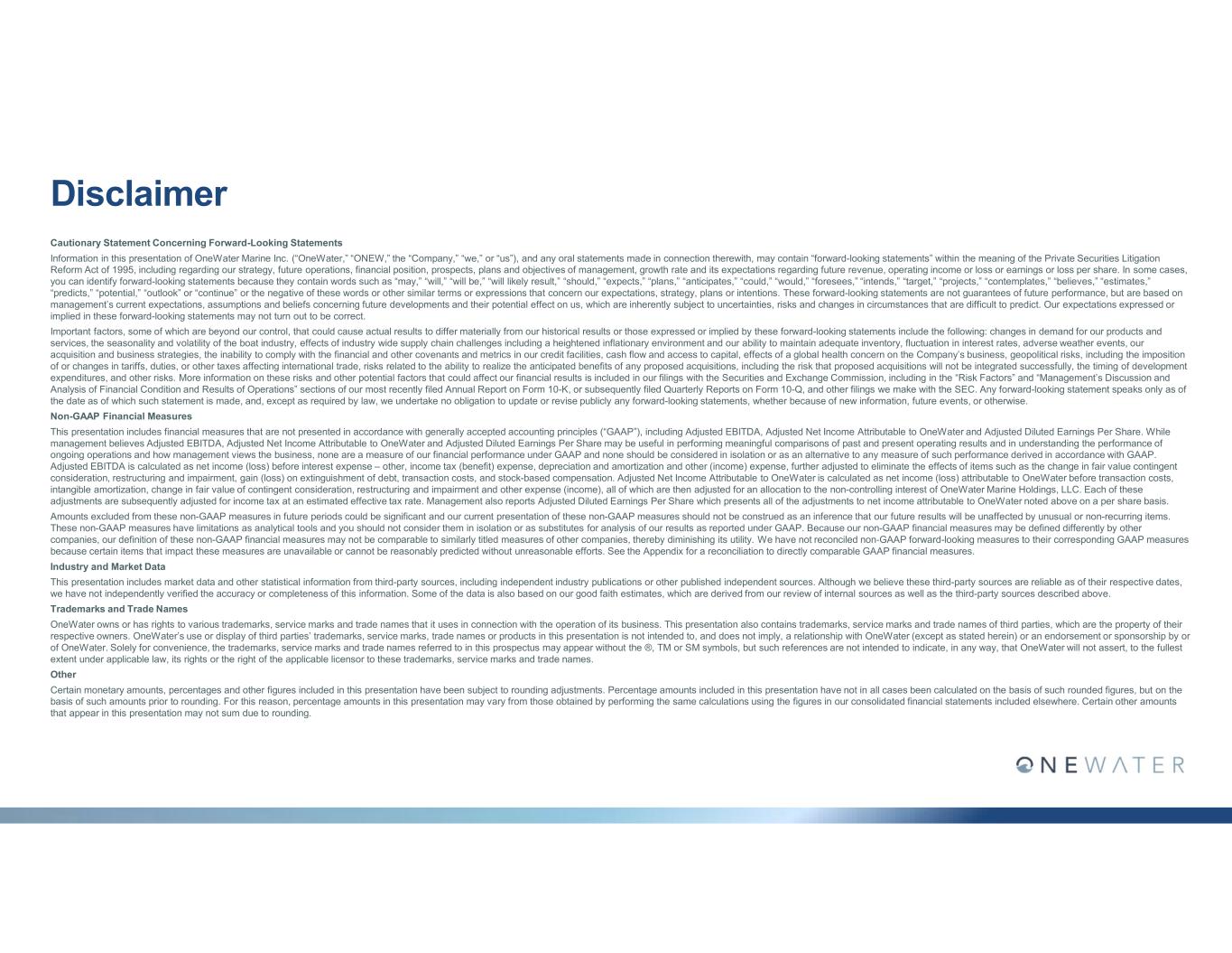 Cautionary Statement Concerning Forward-Looking Statements Information in this presentation of OneWater Marine Inc. (“OneWater,” “ONEW,” the “Company,” “we,” or “us”), and any oral statements made in connection therewith, may contain “forward-looking statements” within the meaning of the Private Securities Litigation Reform Act of 1995, including regarding our strategy, future operations, financial position, prospects, plans and objectives of management, growth rate and its expectations regarding future revenue, operating income or loss or earnings or loss per share. In some cases, you can identify forward-looking statements because they contain words such as “may,” “will,” “will be,” “will likely result,” “should,” “expects,” “plans,” “anticipates,” “could,” “would,” “foresees,” “intends,” “target,” “projects,” “contemplates,” “believes,” “estimates,” “predicts,” “potential,” “outlook” or “continue” or the negative of these words or other similar terms or expressions that concern our expectations, strategy, plans or intentions. These forward-looking statements are not guarantees of future performance, but are based on management’s current expectations, assumptions and beliefs concerning future developments and their potential effect on us, which are inherently subject to uncertainties, risks and changes in circumstances that are difficult to predict. Our expectations expressed or implied in these forward-looking statements may not turn out to be correct. Important factors, some of which are beyond our control, that could cause actual results to differ materially from our historical results or those expressed or implied by these forward-looking statements include the following: changes in demand for our products and services, the seasonality and volatility of the boat industry, effects of industry wide supply chain challenges including a heightened inflationary environment and our ability to maintain adequate inventory, fluctuation in interest rates, adverse weather events, our acquisition and business strategies, the inability to comply with the financial and other covenants and metrics in our credit facilities, cash flow and access to capital, effects of a global health concern on the Company’s business, geopolitical risks, including the imposition of or changes in tariffs, duties, or other taxes affecting international trade, risks related to the ability to realize the anticipated benefits of any proposed acquisitions, including the risk that proposed acquisitions will not be integrated successfully, the timing of development expenditures, and other risks. More information on these risks and other potential factors that could affect our financial results is included in our filings with the Securities and Exchange Commission, including in the “Risk Factors” and “Management’s Discussion and Analysis of Financial Condition and Results of Operations” sections of our most recently filed Annual Report on Form 10-K, or subsequently filed Quarterly Reports on Form 10-Q, and other filings we make with the SEC. Any forward-looking statement speaks only as of the date as of which such statement is made, and, except as required by law, we undertake no obligation to update or revise publicly any forward-looking statements, whether because of new information, future events, or otherwise. Non-GAAP Financial Measures This presentation includes financial measures that are not presented in accordance with generally accepted accounting principles (“GAAP”), including Adjusted EBITDA, Adjusted Net Income Attributable to OneWater and Adjusted Diluted Earnings Per Share. While management believes Adjusted EBITDA, Adjusted Net Income Attributable to OneWater and Adjusted Diluted Earnings Per Share may be useful in performing meaningful comparisons of past and present operating results and in understanding the performance of ongoing operations and how management views the business, none are a measure of our financial performance under GAAP and none should be considered in isolation or as an alternative to any measure of such performance derived in accordance with GAAP. Adjusted EBITDA is calculated as net income (loss) before interest expense – other, income tax (benefit) expense, depreciation and amortization and other (income) expense, further adjusted to eliminate the effects of items such as the change in fair value contingent consideration, restructuring and impairment, gain (loss) on extinguishment of debt, transaction costs, and stock-based compensation. Adjusted Net Income Attributable to OneWater is calculated as net income (loss) attributable to OneWater before transaction costs, intangible amortization, change in fair value of contingent consideration, restructuring and impairment and other expense (income), all of which are then adjusted for an allocation to the non-controlling interest of OneWater Marine Holdings, LLC. Each of these adjustments are subsequently adjusted for income tax at an estimated effective tax rate. Management also reports Adjusted Diluted Earnings Per Share which presents all of the adjustments to net income attributable to OneWater noted above on a per share basis. Amounts excluded from these non-GAAP measures in future periods could be significant and our current presentation of these non-GAAP measures should not be construed as an inference that our future results will be unaffected by unusual or non-recurring items. These non-GAAP measures have limitations as analytical tools and you should not consider them in isolation or as substitutes for analysis of our results as reported under GAAP. Because our non-GAAP financial measures may be defined differently by other companies, our definition of these non-GAAP financial measures may not be comparable to similarly titled measures of other companies, thereby diminishing its utility. We have not recon