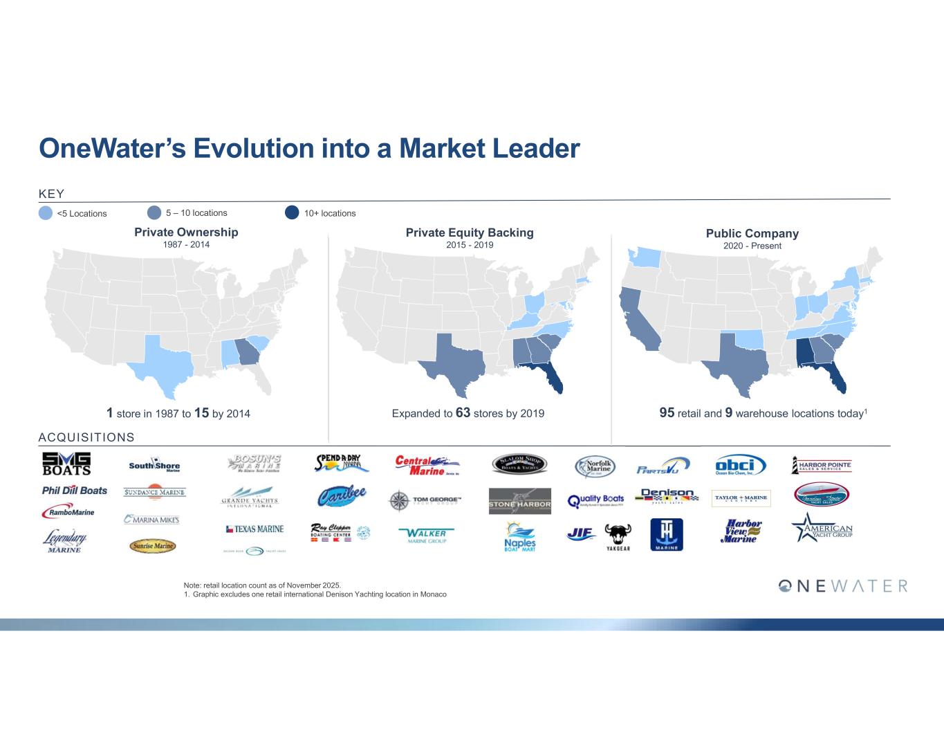 OneWater’s Evolution into a Market Leader Note: retail location count as of November 2025. 1. Graphic excludes one retail international Denison Yachting location in Monaco <5 Locations 5 – 10 locations 10+ locations KEY ACQUISITIONS Private Ownership 1987 - 2014 Private Equity Backing 2015 - 2019 Public Company 2020 - Present 1 store in 1987 to 15 by 2014 Expanded to 63 stores by 2019 95 retail and 9 warehouse locations today1