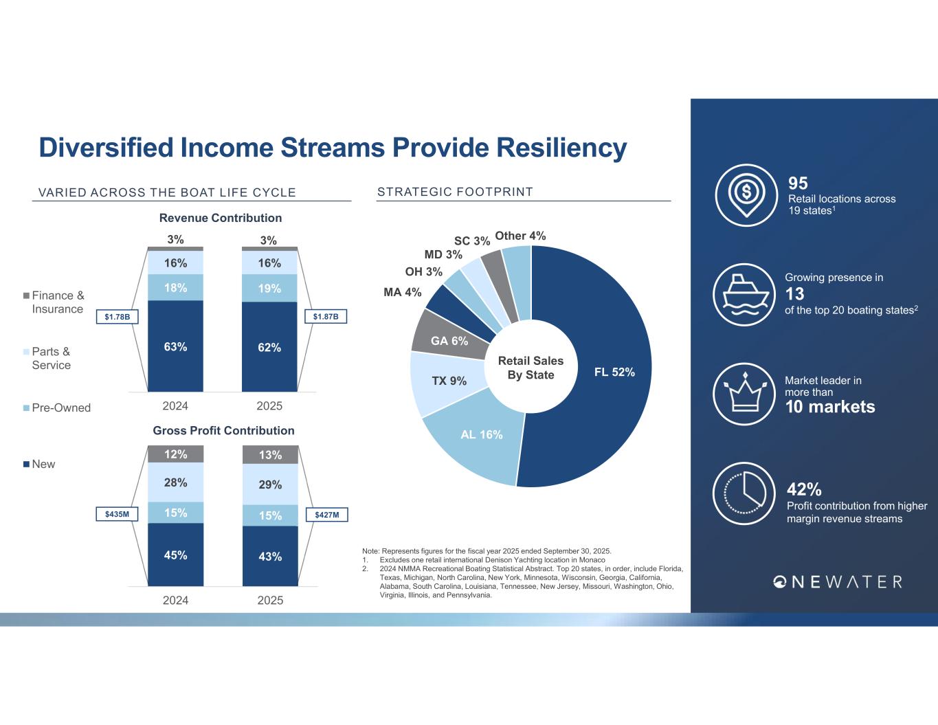 63% 62% 18% 19% 16% 16% 3% 3% 2024 2025 Finance & Insurance Parts & Service Pre-Owned New Diversified Income Streams Provide Resiliency Note: Represents figures for the fiscal year 2025 ended September 30, 2025. 1. Excludes one retail international Denison Yachting location in Monaco 2. 2024 NMMA Recreational Boating Statistical Abstract. Top 20 states, in order, include Florida, Texas, Michigan, North Carolina, New York, Minnesota, Wisconsin, Georgia, California, Alabama, South Carolina, Louisiana, Tennessee, New Jersey, Missouri, Washington, Ohio, Virginia, Illinois, and Pennsylvania. 13 of the top 20 boating states2 Market leader in more than 10 markets 95 Retail locations across 19 states1 42% Profit contribution from higher margin revenue streams FL 52% AL 16% TX 9% GA 6% MA 4% OH 3% MD 3% SC 3% Other 4% Retail Sales By State Growing presence in VARIED ACROSS THE BOAT LIFE CYCLE STRATEGIC FOOTPRINT Revenue Contribution 45% 43% 15% 15% 28% 29% 12% 13% 2024 2025 Gross Profit Contribution $1.78B $1.87B $435M $427M