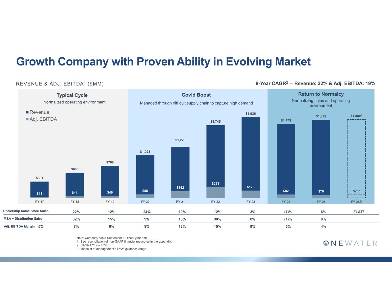 Growth Company with Proven Ability in Evolving Market REVENUE & ADJ. EBITDA1 ($MM) Note: Company has a September 30 fiscal year end. 1. See reconciliation of non-GAAP financial measures in the appendix. 2. CAGR FY17 – FY25. 3. Midpoint of management’s FY26 guidance range FLAT36%(7)%3%12%10%24%12%22% 0%(1)%8%30%10%9%15%32% 4%5%9%15%13%8%6%7%5% Adj. EBITDA Margin $391 $603 $768 $1,023 $1,228 $1,745 $1,936 $1,773 $1,872 $1,8803 $18 $41 $46 $85 $162 $258 $176 $82 $70 $753 FY 17 FY 18 FY 19 FY 20 FY 21 FY 22 FY 23 FY 24 FY 25 FY 26E Revenue Adj. EBITDA Typical Cycle Covid Boost Return to Normalcy Normalized operating environment Managed through difficult supply chain to capture high demand Normalizing sales and operating environment 8-Year CAGR2 – Revenue: 22% & Adj. EBITDA: 19% Dealership Same Store Sales M&A + Distribution Sales