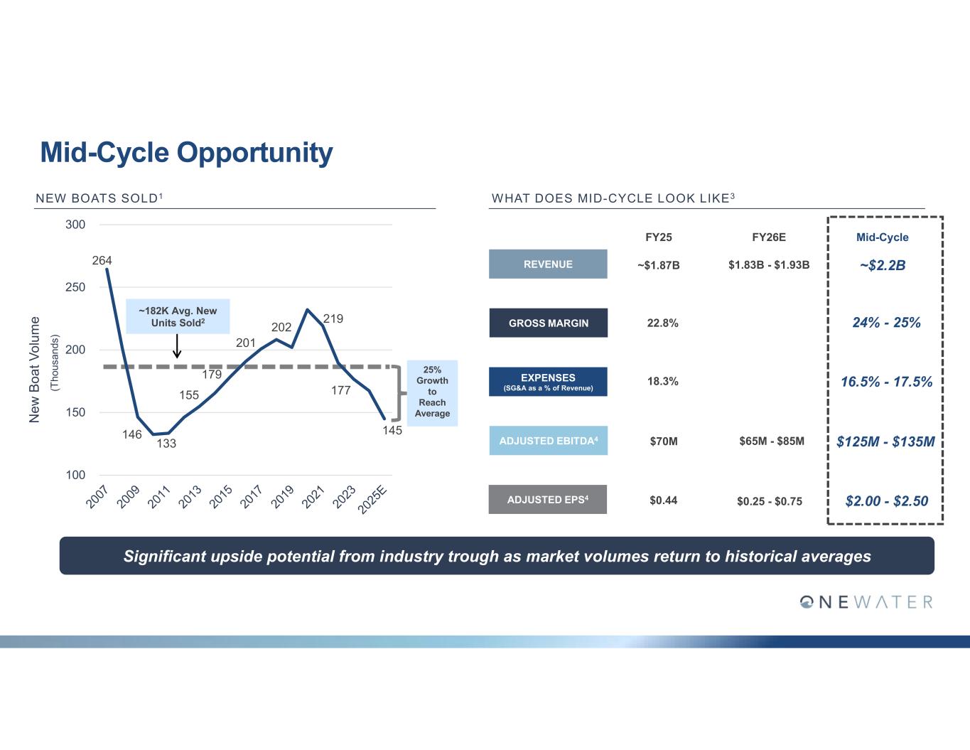Mid-Cycle Opportunity 264 146 133 155 179 201 202 219 177 145 100 150 200 250 300 N e w B o a t V o lu m e (T ho us an ds ) ~182K Avg. New Units Sold2 REVENUE GROSS MARGIN EXPENSES (SG&A as a % of Revenue) ADJUSTED EBITDA4 NEW BOATS SOLD1 WHAT DOES MID-CYCLE LOOK LIKE3 Significant upside potential from industry trough as market volumes return to historical averages FY25 FY26E Mid-Cycle ~$2.2B$1.83B - $1.93B~$1.87B 22.8% 24% - 25% 18.3% 16.5% - 17.5% $125M - $135M$70M $65M - $85M ADJUSTED EPS4 $0.25 - $0.75$0.44 $2.00 - $2.50 25% Growth to Reach Average