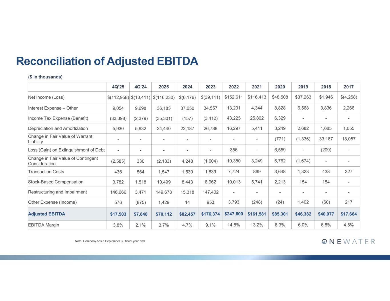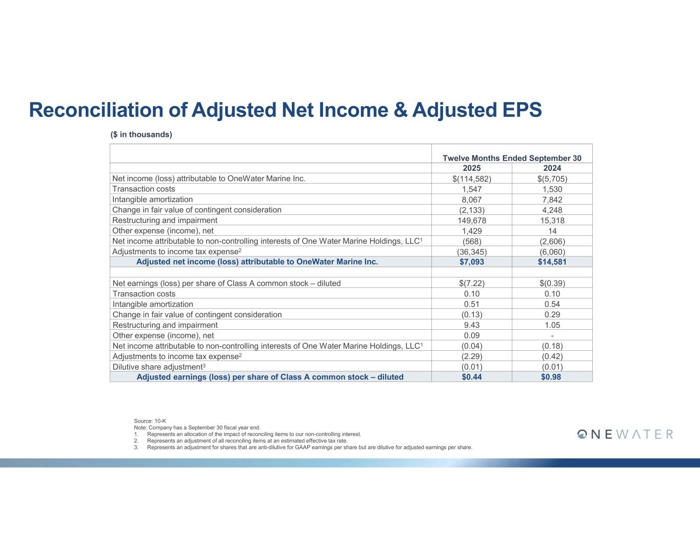 Reconciliation of Adjusted Net Income & Adjusted EPS ($ in thousands) Twelve Months Ended September 30 20242025 $(5,705)$(114,582)Net income (loss) attributable to OneWater Marine Inc. 1,5301,547Transaction costs 7,8428,067Intangible amortization 4,248(2,133)Change in fair value of contingent consideration 15,318149,678Restructuring and impairment 141,429Other expense (income), net (2,606)(568)Net income attributable to non-controlling interests of One Water Marine Holdings, LLC1 (6,060)(36,345)Adjustments to income tax expense2 $14,581$7,093Adjusted net income (loss) attributable to OneWater Marine Inc. $(0.39)$(7.22)Net earnings (loss) per share of Class A common stock – diluted 0.100.10Transaction costs 0.540.51Intangible amortization 0.29(0.13)Change in fair value of contingent consideration 1.059.43Restructuring and impairment -0.09Other expense (income), net (0.18)(0.04)Net income attributable to non-controlling interests of One Water Marine Holdings, LLC1 (0.42)(2.29)Adjustments to income tax expense2 (0.01)(0.01)Dilutive share adjustment3 $0.98$0.44Adjusted earnings (loss) per share of Class A common stock – diluted Source: 10-K Note: Company has a September 30 fiscal year end. 1. Represents an allocation of the impact of reconciling items to our non-controlling interest. 2. Represents an adjustment of all reconciling items at an estimated effective tax rate. 3. Represents an adjustment for shares that are anti-dilutive for GAAP earnings per share but are dilutive for adjusted earnings per share.