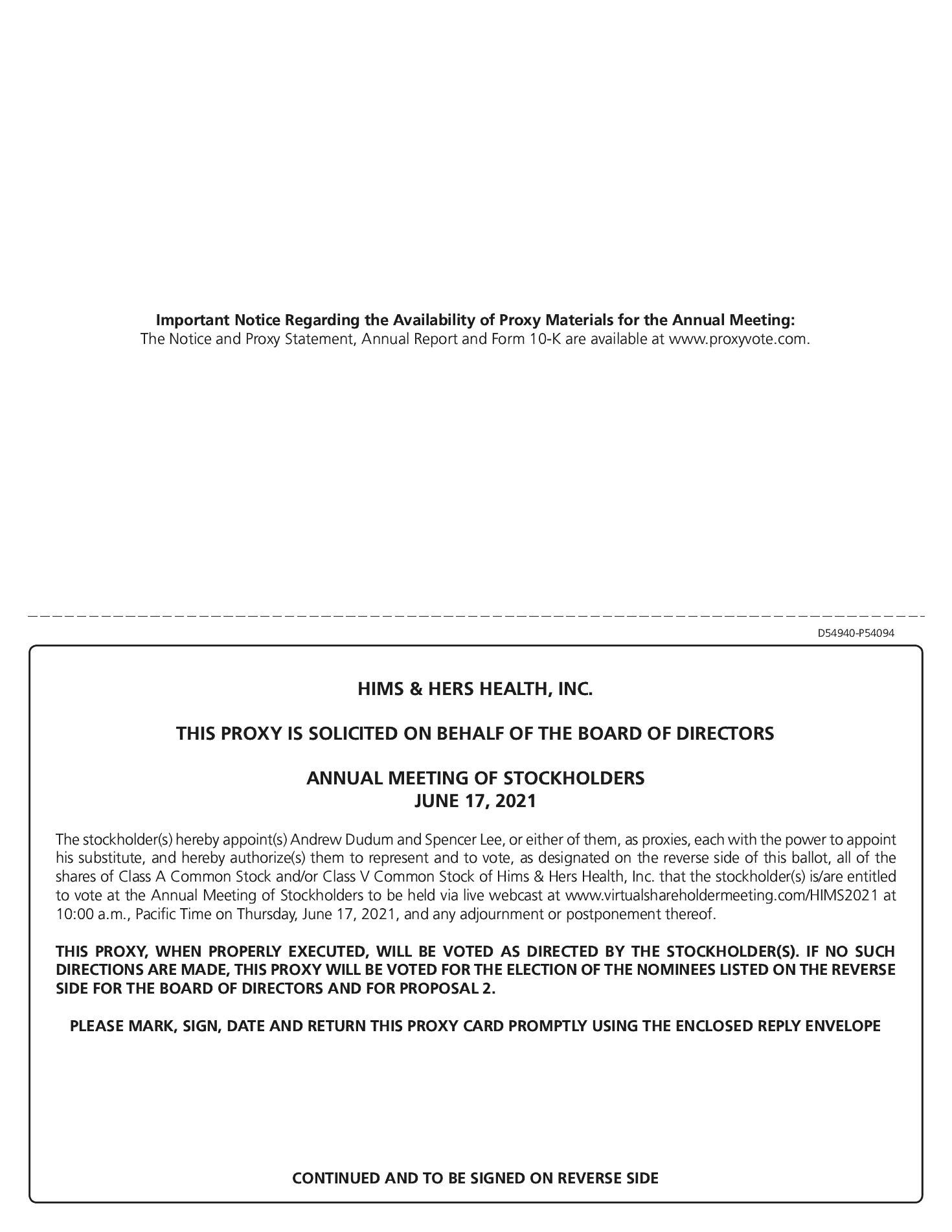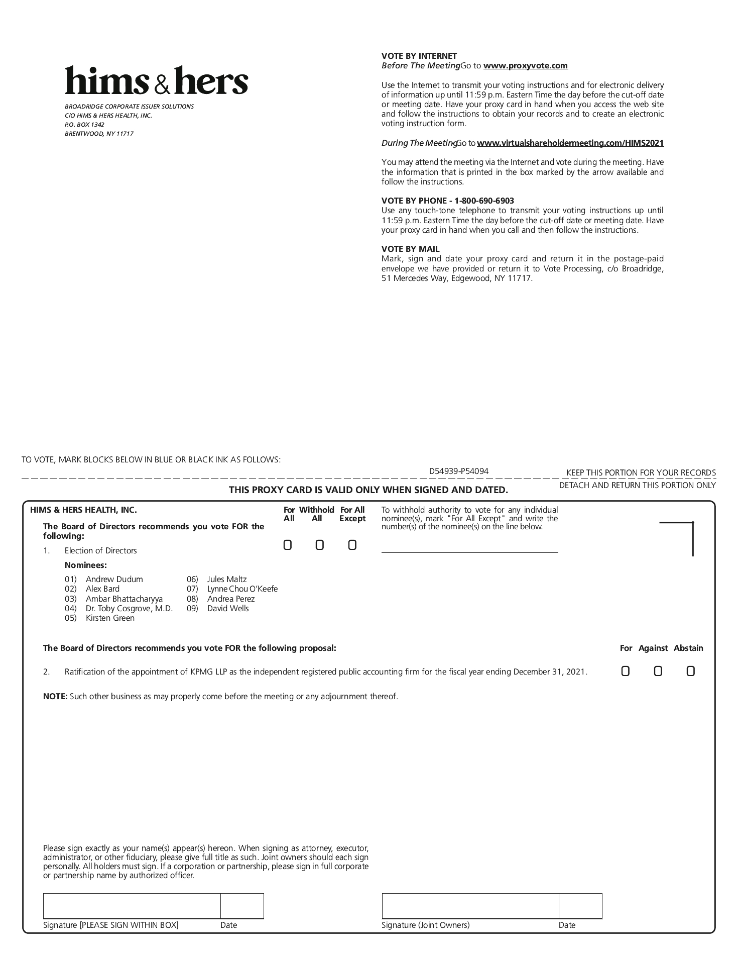 In addition, during the subsequent period through May 14, 2021, neither Hims & Hers, nor any party on behalf of Hims & Hers, consulted with KPMG with respect to either (i) the application of accounting principles to a specified transaction, either completed or proposed, or the type of the audit opinion that might be rendered