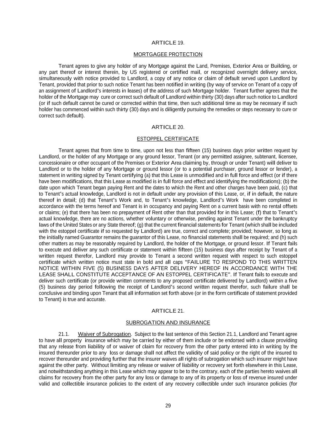 29 ARTICLE 19. MORTGAGEE PROTECTION Tenant agrees to give any holder of any Mortgage against the Land, Premises, Exterior Area or Building, or any part thereof or interest therein, by US registered or certified mail, or recognized overnight delivery service, simultaneously with notice provided to Landlord, a copy of any notice or claim of default served upon Landlord by Tenant, provided that prior to such notice Tenant has been notified in writing (by way of service on Tenant of a copy of an assignment of Landlord’s interests in leases) of the address of such Mortgage holder. Tenant further agrees that the holder of the Mortgage may cure or correct such default of Landlord within thirty (30) days after such notice to Landlord (or if such default cannot be cured or corrected within that time, then such additional time as may be necessary if such holder has commenced within such thirty (30) days and is diligently pursuing the remedies or steps necessary to cure or correct such default). ARTICLE 20. ESTOPPEL CERTIFICATE Tenant agrees that from time to time, upon not less than fifteen (15) business days prior written request by Landlord, or the holder of any Mortgage or any ground lessor, Tenant (or any permitted assignee, subtenant, licensee, concessionaire or other occupant of the Premises or Exterior Area claiming by, through or under Tenant) will deliver to Landlord or to the holder of any Mortgage or ground lessor (or to a potential purchaser, ground lessor or lender), a statement in writing signed by Tenant certifying (a) that this Lease is unmodified and in full force and effect (or if there have been modifications, that this Lease as modified is in full force and effect and identifying the modifications); (b) the date upon which Tenant began paying Rent and the dates to which the Rent and other charges have been paid, (c) that to Tenant’s actual knowledge, Landlord is not in default under any provision of this Lease, or, if in default, the nature thereof in detail; (d) that Tenant’s Work and, to Tenant’s knowledge, Landlord’s Work have been completed in accordance with the terms hereof and Tenant is in occupancy and paying Rent on a current basis with no rental offsets or claims; (e) that there has been no prepayment of Rent other than that provided for in this Lease; (f) that to Tenant’s actual knowledge, there are no actions, whether voluntary or otherwise, pending against Tenant under the bankruptcy laws of the United States or any State thereof; (g) that the current financial statements for Tenant (which shall be included with the estoppel certificate if so requested by Landlord) are true, correct and complete; provided; however, so long as the initially named Guarantor remains the guarantor of this Lease, no financial statements shall be required; and (h) such other matters as may be reasonably required by Landlord, the holder of the Mortgage, or ground lessor. If Tenant fails to execute and deliver any such certificate or statement within fifteen (15) business days after receipt by Tenant of a written request therefor, Landlord may provide to Tenant a second written request with respect to such estoppel certificate which written notice must state in bold and all caps “FAILURE TO RESPOND TO THIS WRITTEN NOTICE WITHIN FIVE (5) BUSINESS DAYS AFTER DELIVERY HEREOF IN ACCORDANCE WITH THE LEASE SHALL CONSTITUTE ACCEPTANCE OF AN ESTOPPEL CERTIFICATE”. If Tenant fails to execute and deliver such certificate (or provide written comments to any proposed certificate delivered by Landlord) within a five (5) business day period following the receipt of Landlord’s second written request therefor, such failure shall be conclusive and binding upon Tenant that all information set forth above (or in the form certificate of statement provided to Tenant) is true and accurate. ARTICLE 21. SUBROGATION AND INSURANCE 21.1. Waiver of Subrogation. Subject to the last sentence of this Section 21.1, Landlord and Tenant agree to have all property insurance which may be carried by either of them include or be endorsed with a clause providing that any release from liability of or waiver of claim for recovery from the other party entered into in writing by the insured thereunder prior to any loss or damage shall not affect the validity of said policy or the right of the insured to recover thereunder and providing further that the insurer waives all rights of subrogation which such insurer might have against the other party. Without limiting any release or waiver of liability or recovery set forth elsewhere in this Lease, and notwithstanding anything in this Lease which may appear to be to the contrary, each of the parties hereto waives all claims for recovery from the other party for any loss or damage to any of its property or loss of revenue insured under valid and collectible insurance policies to the extent of any recovery collectible under such insurance policies (for