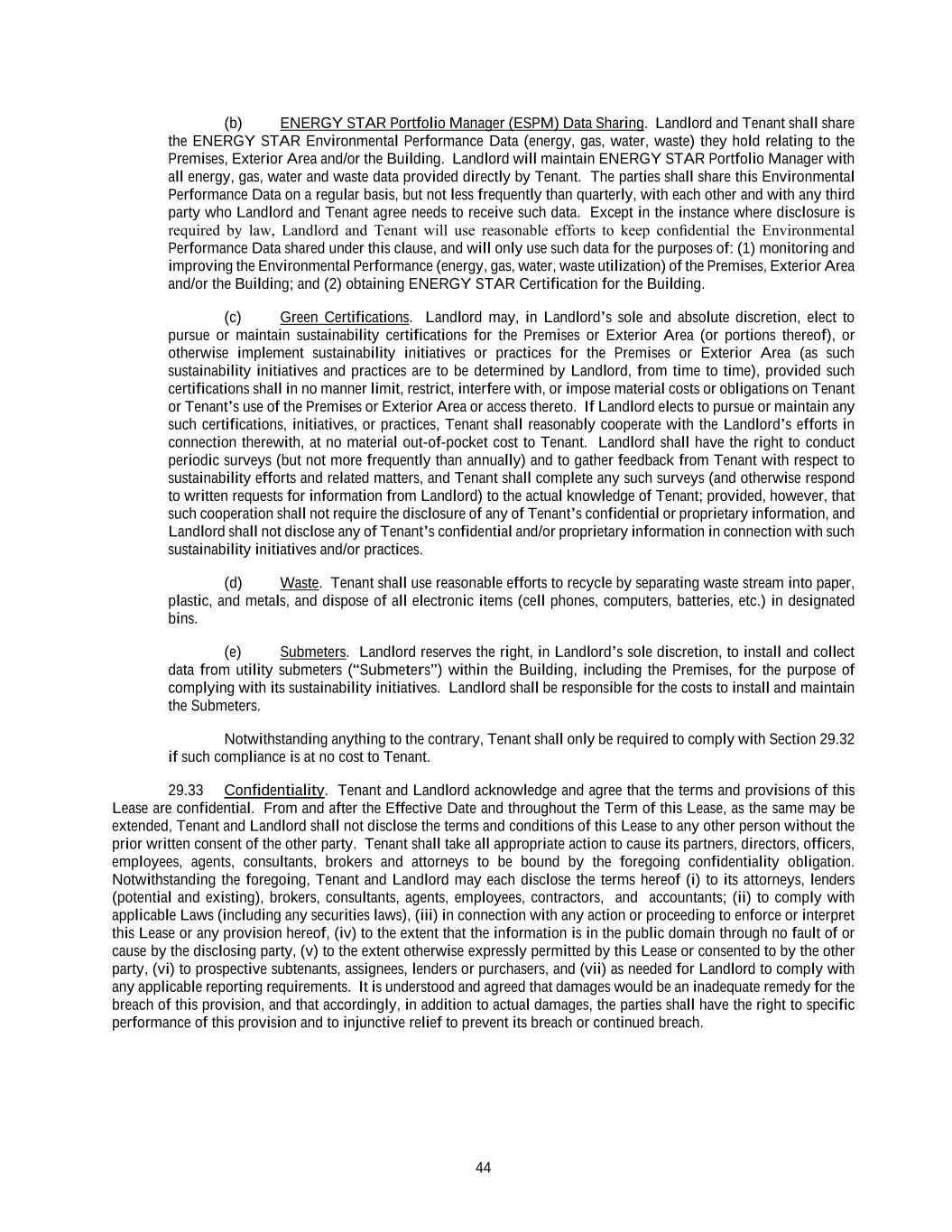 44 (b) ENERGY STAR Portfolio Manager (ESPM) Data Sharing. Landlord and Tenant shall share the ENERGY STAR Environmental Performance Data (energy, gas, water, waste) they hold relating to the Premises, Exterior Area and/or the Building. Landlord will maintain ENERGY STAR Portfolio Manager with all energy, gas, water and waste data provided directly by Tenant. The parties shall share this Environmental Performance Data on a regular basis, but not less frequently than quarterly, with each other and with any third party who Landlord and Tenant agree needs to receive such data. Except in the instance where disclosure is required by law, Landlord and Tenant will use reasonable efforts to keep confidential the Environmental Performance Data shared under this clause, and will only use such data for the purposes of: (1) monitoring and improving the Environmental Performance (energy, gas, water, waste utilization) of the Premises, Exterior Area and/or the Building; and (2) obtaining ENERGY STAR Certification for the Building. (c) Green Certifications. Landlord may, in Landlord’s sole and absolute discretion, elect to pursue or maintain sustainability certifications for the Premises or Exterior Area (or portions thereof), or otherwise implement sustainability initiatives or practices for the Premises or Exterior Area (as such sustainability initiatives and practices are to be determined by Landlord, from time to time), provided such certifications shall in no manner limit, restrict, interfere with, or impose material costs or obligations on Tenant or Tenant’s use of the Premises or Exterior Area or access thereto. If Landlord elects to pursue or maintain any such certifications, initiatives, or practices, Tenant shall reasonably cooperate with the Landlord’s efforts in connection therewith, at no material out-of-pocket cost to Tenant. Landlord shall have the right to conduct periodic surveys (but not more frequently than annually) and to gather feedback from Tenant with respect to sustainability efforts and related matters, and Tenant shall complete any such surveys (and otherwise respond to written requests for information from Landlord) to the actual knowledge of Tenant; provided, however, that such cooperation shall not require the disclosure of any of Tenant’s confidential or proprietary information, and Landlord shall not disclose any of Tenant’s confidential and/or proprietary information in connection with such sustainability initiatives and/or practices. (d) Waste. Tenant shall use reasonable efforts to recycle by separating waste stream into paper, plastic, and metals, and dispose of all electronic items (cell phones, computers, batteries, etc.) in designated bins. (e) Submeters. Landlord reserves the right, in Landlord’s sole discretion, to install and collect data from utility submeters (“Submeters”) within the Building, including the Premises, for the purpose of complying with its sustainability initiatives. Landlord shall be responsible for the costs to install and maintain the Submeters. Notwithstanding anything to the contrary, Tenant shall only be required to comply with Section 29.32 if such compliance is at no cost to Tenant. 29.33 Confidentiality. Tenant and Landlord acknowledge and agree that the terms and provisions of this Lease are confidential. From and after the Effective Date and throughout the Term of this Lease, as the same may be extended, Tenant and Landlord shall not disclose the terms and conditions of this Lease to any other person without the prior written consent of the other party. Tenant shall take all appropriate action to cause its partners, directors, officers, employees, agents, consultants, brokers and attorneys to be bound by the foregoing confidentiality obligation. Notwithstanding the foregoing, Tenant and Landlord may each disclose the terms hereof (i) to its attorneys, lenders (potential and existing), brokers, consultants, agents, employees, contractors, and accountants; (ii) to comply with applicable Laws (including any securities laws), (iii) in connection with any action or proceeding to enforce or interpret this Lease or any provision hereof, (iv) to the extent that the information is in the public domain through no fault of or cause by the disclosing party, (v) to the extent otherwise expressly permitted by this Lease or consented to by the other party, (vi) to prospective subtenants, assignees, lenders or purchasers, and (vii) as needed for Landlord to comply with any applicable reporting requirements. It is understood and agreed that damages would be an inadequate remedy for the breach of this provision, and that accordingly, in addition to actual damages, the parties shall have the right to specific performance of this provision and to injunctive relief to prevent its breach or continued breach.