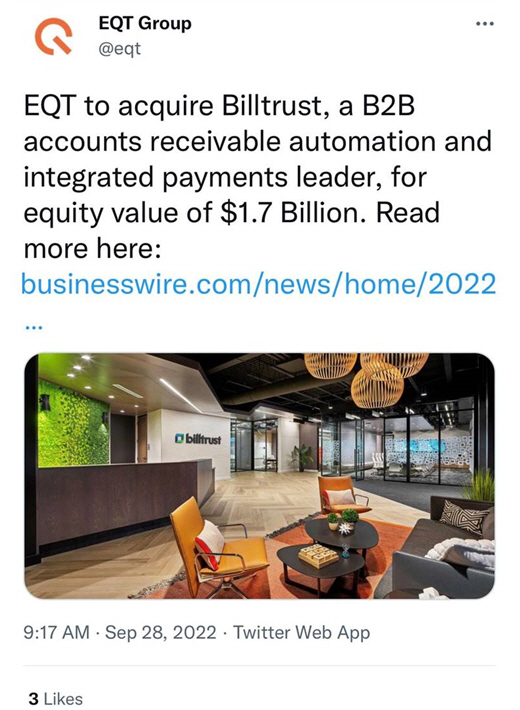 The post contains a link to https://www.businesswire.com/news/home/20220928005565/en/Billtrust-to-be-Acquired-by-EQT-Private-Equity-for-Equity-Value-of-1.7-Billion.