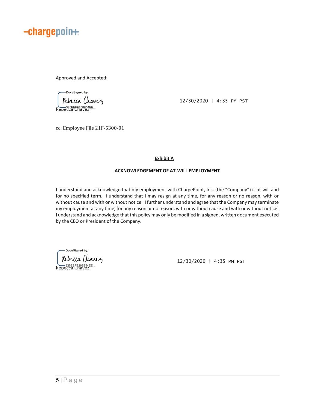 1 | P a g e December 30, 2020 Rebecca Chavez chavez99@stanfordalumni.org Dear Rebecca, On behalf of ChargePoint, Inc. (the “Company”), I am pleased to offer you the full-time position of General Counsel as head of our Legal Department and you shall report to the Chief Financial Officer. It is expected that you will be working out of our office located in Campbell, CA, unless you are traveling on business. As explained in more detail below, your employment is contingent upon your assent to the terms and conditions set forth in this letter and the attachments hereto. If, after careful review, the terms discussed below and in the attachments hereto are acceptable to you, please sign this confirmation letter and the attached Acknowledgement of At-Will Employment, Proprietary Information and Inventions Agreement and Agreement to Arbitrate where indicated and return them to us. 1. Compensation. a. Salary. You will be paid a salary of $330,000.00 per year, paid on a semi-monthly basis, less applicable withholdings and deductions. All reasonable business expenses that are documented by you and incurred in the ordinary course of business will be reimbursed in accordance with the Company’s standard policies and procedures. b. Bonus. In addition, you will be eligible for an executive bonus for each fiscal year of the Company. The executive bonus program is based upon the Company’s execution relative to our Annual Operating Plan (AOP) and progress towards achievement of our annual corporate goals. Your target bonus will be equal to 30% of your annual base salary. Any bonus for the fiscal year in which your employment begins will be prorated, based on the number of days you are employed by the Company during that fiscal year. You are guaranteed to earn 100% of the prorated portion of your fiscal year 2021 bonus through January 31, 2022. Any bonus for a fiscal year will be paid after the close of that fiscal year, but only if you are still employed by the Company at the time of payment. The determinations of the Company’s Board of Directors with respect to your bonus will be final and binding. b. Incentive Stock Plan. As you are likely aware, the Company has signed an agreement to merge with a publicly traded company. Subject to the successful completion of that transaction, management will recommend to the appropriate committee of the publicly traded company’s board of directors that you be granted a number of restricted stock units (or RSUs), each representing the right to receive one share of the publicly traded company’s common stock, with a target value of $1,250,000.00. The actual number of RSUs will be determined when the RSUs are granted using the closing trading price of the publicly traded company’s common stock on the date the RSUs are granted. Such RSUs will be subject to vesting restrictions and other terms and conditions set forth in the Restricted Stock Unit Agreement to be entered into between you and the publicly company and the applicable stock plan. If the merger is not completed for any reason, we will re-evaluate our equity program and may recommend that you be granted a different type of equity award by the Company. By execution of this letter, you acknowledge Exhibit 10.2 2 | P a g e that you have no right to receive any RSUs or any other equity award unless the grant is approved by the applicable company’s board of directors Acceleration in the Event of a Corporate Transaction. In the event your employment is terminated (as defined below) by the Company without Cause (as defined below) or by you for good reason (as defined below) within the twelve (12) month period following a Corporate Transaction, then, in addition to RSU’s which have already vested, you will receive accelerated vesting on an additional fifty percent (50%) of unvested RSU’s; provided, however, that the aggregate number of shares shall not exceed the number of RSU’s specified in Section 1(b) above; provided, further, that you execute a release of claims in a form reasonably acceptable to the Company. c. Paid Time Away, Holidays and Sick-Leave. As a full-time employee, you will be eligible for paid time away in accordance with the Company’s standard policies and procedures. Holidays and sick- leave will likewise be provided in accordance with the Company’s standard policies and procedures. d. Benefits. As a full-time employee, you will be eligible to participate in and to receive benefits under such plans and benefits as may be adopted by the Company. The eligibility criteria and amount and extent of benefits to which you are entitled shall be governed by the specific benefit plan as it may be amended from time to time. 2. Severance a) General Terms. In no way limiting the Company’s policy of employment at-will, if your employment is terminated by the Company without Cause (as defined below) or by you for Good Reason, and other than as a result of your death or disability, the Company will offer certain severance benefits to you. As a condition to your receipt of such benefits, you are required to comply with your continuing obligations (including the return of any Company property), resign from all positions you hold with the Company, and execute the Company’s standard form of release agreement attached hereto as Exhibit A releasing any claims you may have against the Company. The Release must be executed and returned to the Company on or before the date specified in the form (i.e. 21 days after your termination date) unless the Company provides additional time, with the deadline in no event later than 45 days after your termination of employment. For purposes of the paragraphs below your role is defined as the General Counsel. i) A lump sum payment equal to six (6) months of your then current salary, less all applicable deductions and withholdings. ii) A lump sum payment equal to six (6) months of your benefit premiums. iii) All cash payments pursuant to this Subsection 2 shall