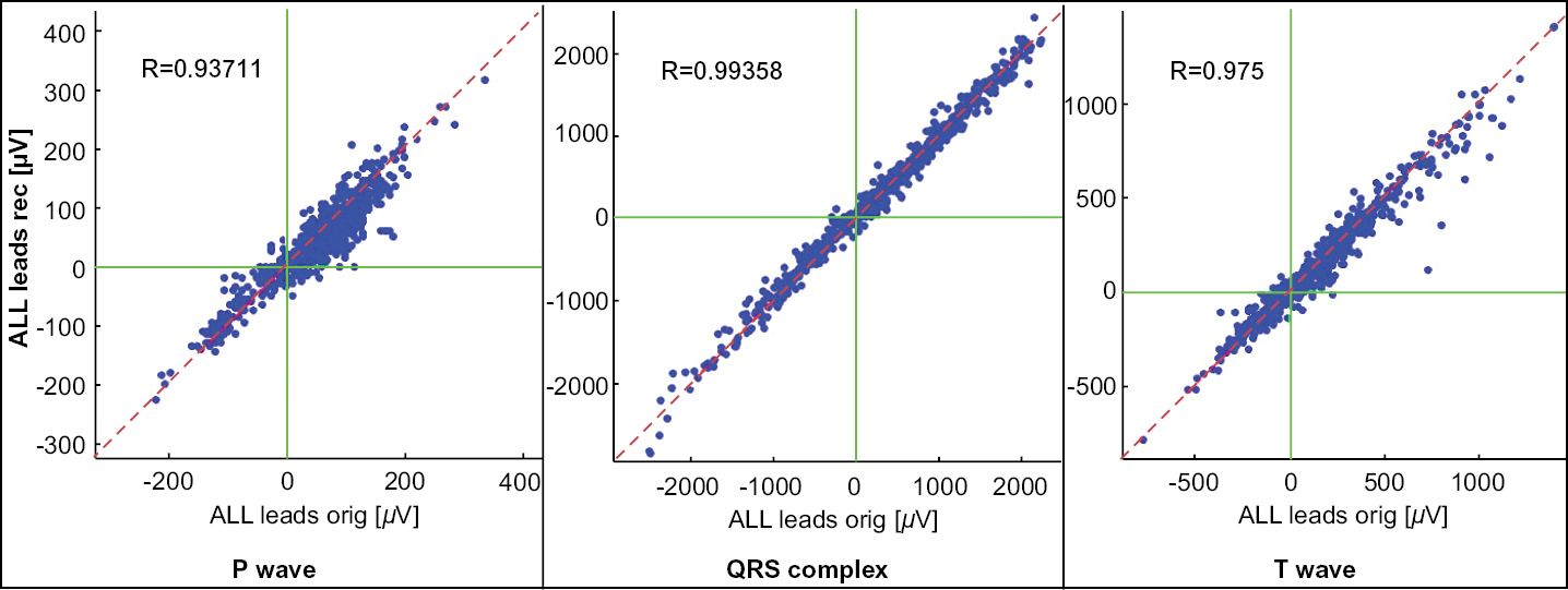 3. A cloud-based software system that serves three basic functions: (1) Performing a final check of the ECG signal quality, (2) Synthesizing a 12-lead ECG from the measured (recorded) 3 vector leads, and (3) Preparing a summary report for the physician. In order to facilitate a more accurate physician interpretation of the data, the software overlays the patient’s synthesized baseline 12 lead ECG waveform on the synthesized 12 lead ECG waveform from the current event. To ensure high signal quality, the system checks for noise levels in the recorded signals. Those signals that can be effectively filtered are accepted and those that have a noise level above an empirically established threshold are rejected. If a recorded signal is rejected, the user is asked to repeat the recording.