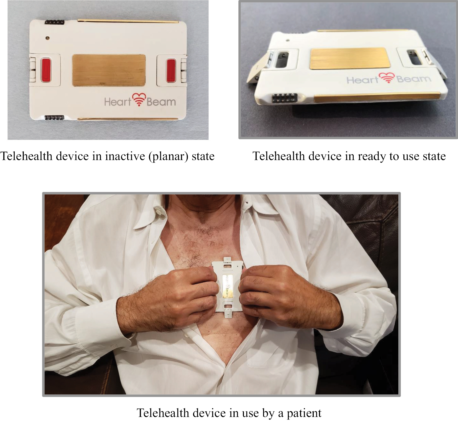 Our telehealth ECG collection device is the size of a credit card and records cardiac signals with integrated electrodes rather than wires or self-adhesive electrodes. Unlike a standard 12-lead ECG machine that records signals in empirically determined locations on a human body, our approach is focused on recording three projections of the heart vector. The successful recording of the projections of the heart vector enables the synthesis of a 12-lead signal set as well internal algorithmic diagnostic work in the space of 3D heart vectors.