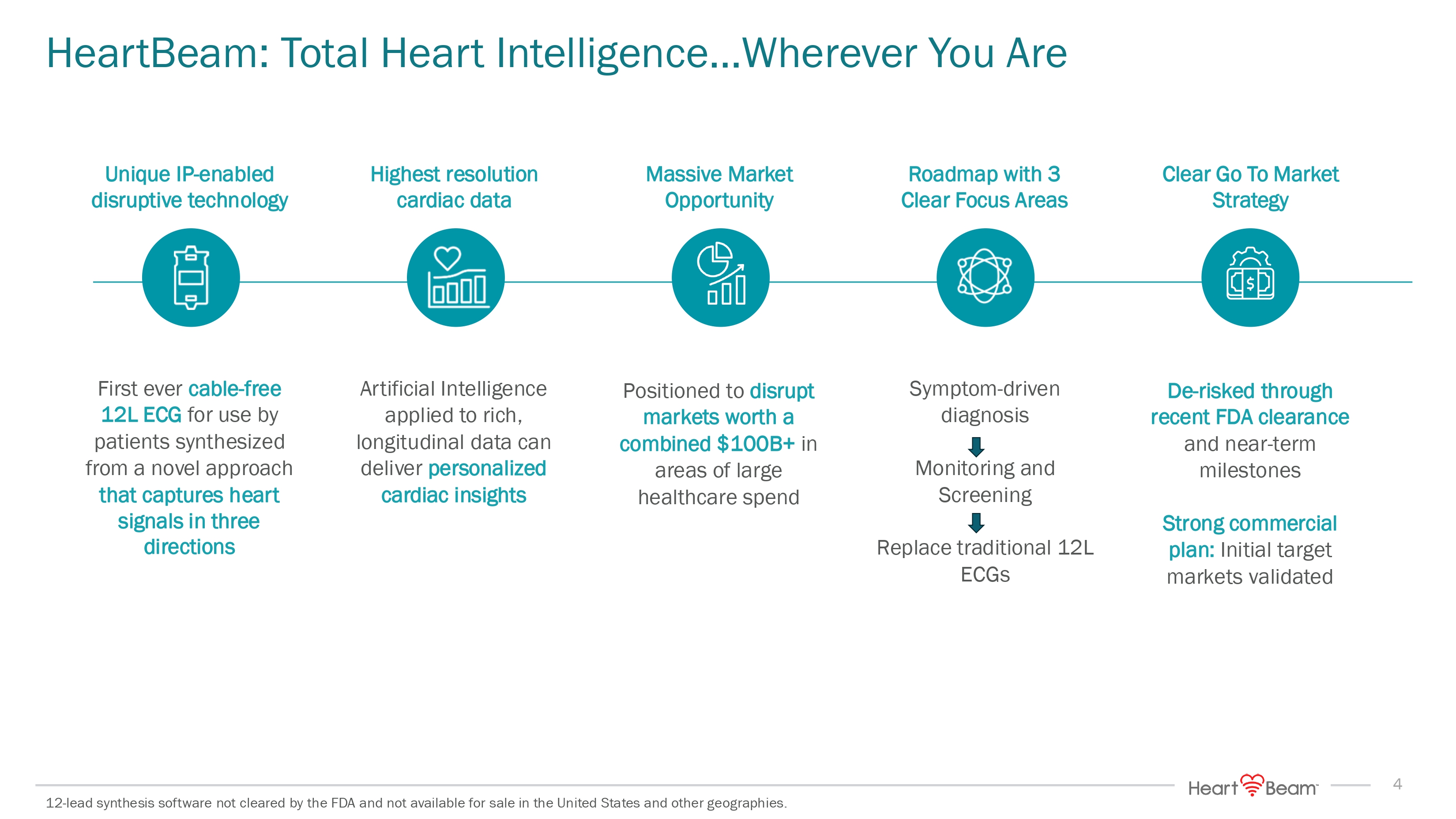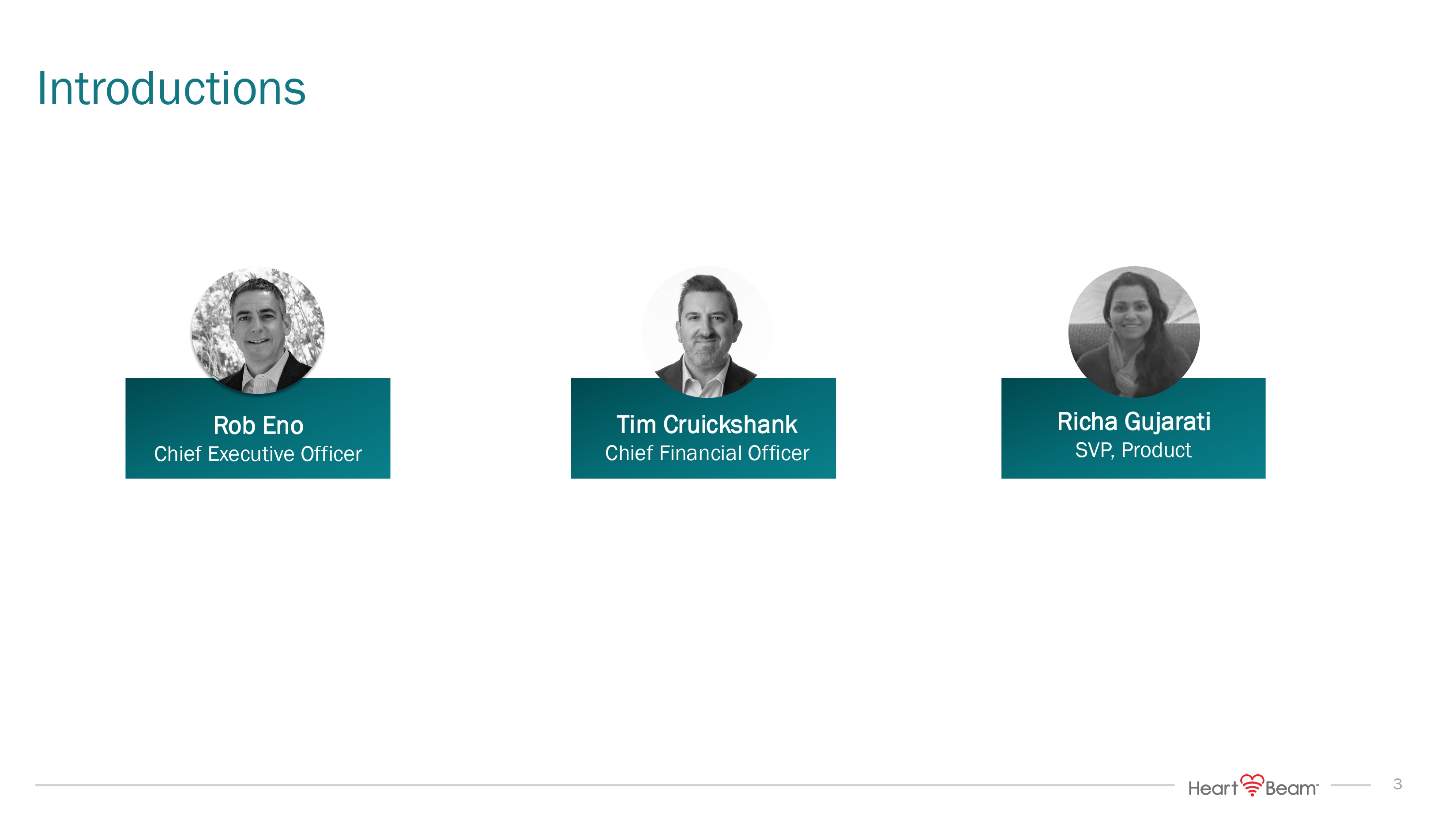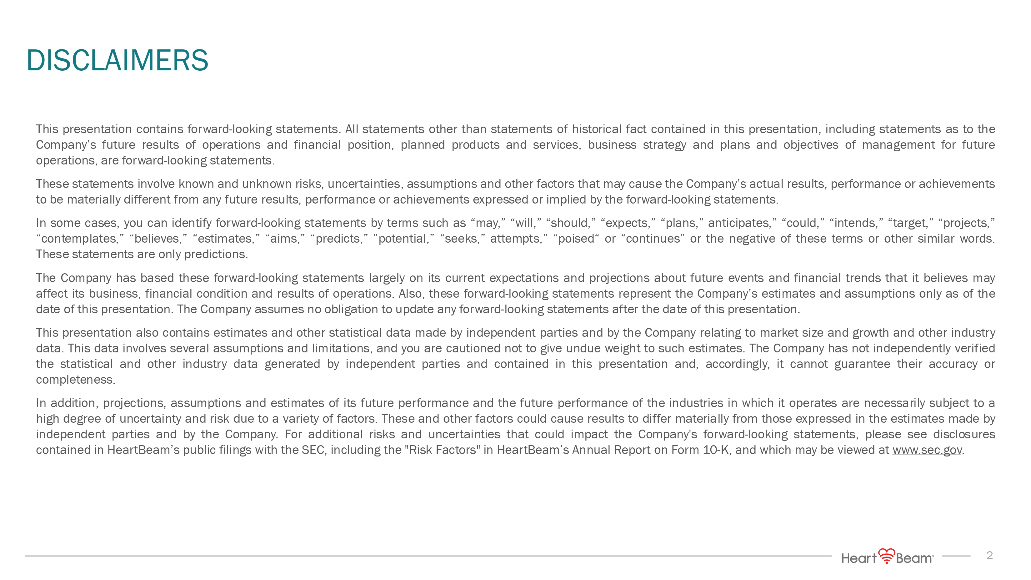 2 This presentation contains forward - looking statements . All statements other than statements of historical fact contained in this presentation, including statements as to the Company’s future results of operations and financial position, planned products and services, business strategy and plans and objectives of management for future operations, are forward - looking statements . These statements involve known and unknown risks, uncertainties, assumptions and other factors that may cause the Company’s actual results, performance or achievements to be materially different from any future results, performance or achievements expressed or implied by the forward - looking statements . In some cases, you can identify forward - looking statements by terms such as “may,” “will,” “should,” “expects,” “plans,” anticipates,” “could,” “intends,” “target,” “projects,” “contemplates,” “believes,” “estimates,” “aims,” “predicts,” ”potential,” “seeks,” attempts,” “poised“ or “continues” or the negative of these terms or other similar words . These statements are only predictions . The Company has based these forward - looking statements largely on its current expectations and projections about future events and financial trends that it believes may affect its business, financial condition and results of operations . Also, these forward - looking statements represent the Company’s estimates and assumptions only as of the date of this presentation . The Company assumes no obligation to update any forward - looking statements after the date of this presentation . This presentation also contains estimates and other statistical data made by independent parties and by the Company relating to market size and growth and other industry data . This data involves several assumptions and limitations, and you are cautioned not to give undue weight to such estimates . The Company has not independently verified the statistical and other industry data generated by independent parties and contained in this presentation and, accordingly, it cannot guarantee their accuracy or completeness . In addition, projections, assumptions and estimates of its future performance and the future performance of the industries in which it operates are necessarily subject to a high degree of uncertainty and risk due to a variety of factors . These and other factors could cause results to differ materially from those expressed in the estimates made by independent parties and by the Company . For additional risks and uncertainties that could impact the Company's forward - looking statements, please see disclosures contained in HeartBeam’s public filings with the SEC, including the "Risk Factors" in HeartBeam’s Annual Report on Form 10 - K, and which may be viewed at www . sec . gov . DISCLAIMERS