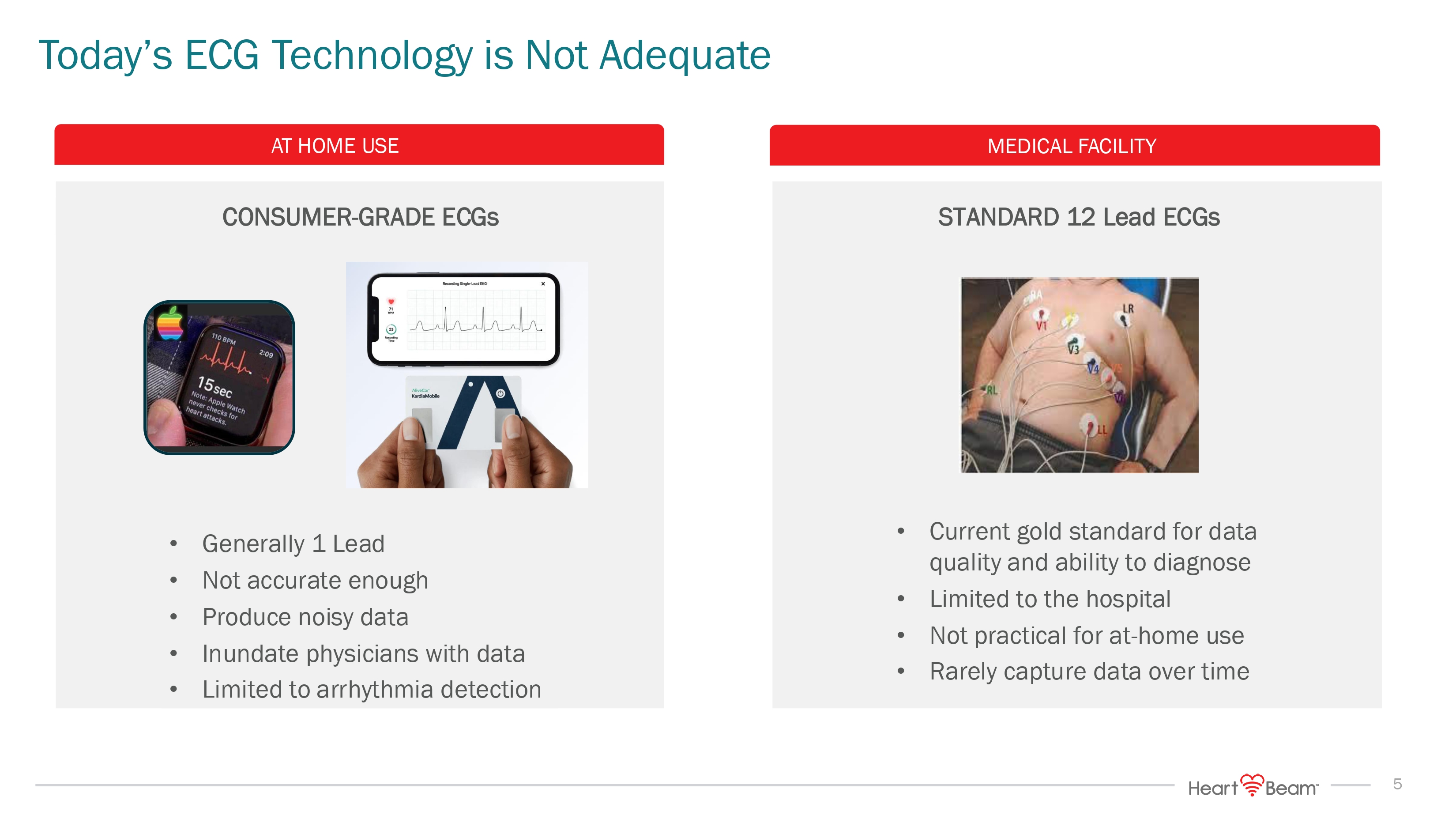 4 HeartBeam: Total Heart Intelligence…Wherever You Are De - risked through recent FDA clearance and near - term milestones Strong commercial plan: Initial target markets validated First ever cable - free 12L ECG for use by patients synthesized from a novel approach that captures heart signals in three directions Positioned to disrupt markets worth a combined $100B+ in areas of large healthcare spend Symptom - driven diagnosis Monitoring and Screening Replace traditional 12L ECGs Unique IP - enabled disruptive technology Roadmap with 3 Clear Focus Areas Massive Market Opportunity Clear Go To Market Strategy Artificial Intelligence applied to rich, longitudinal data can deliver personalized cardiac insights Highest resolution cardiac data 12 - lead synthesis software not cleared by the FDA and n ot available for sale in the United States and other geographies.