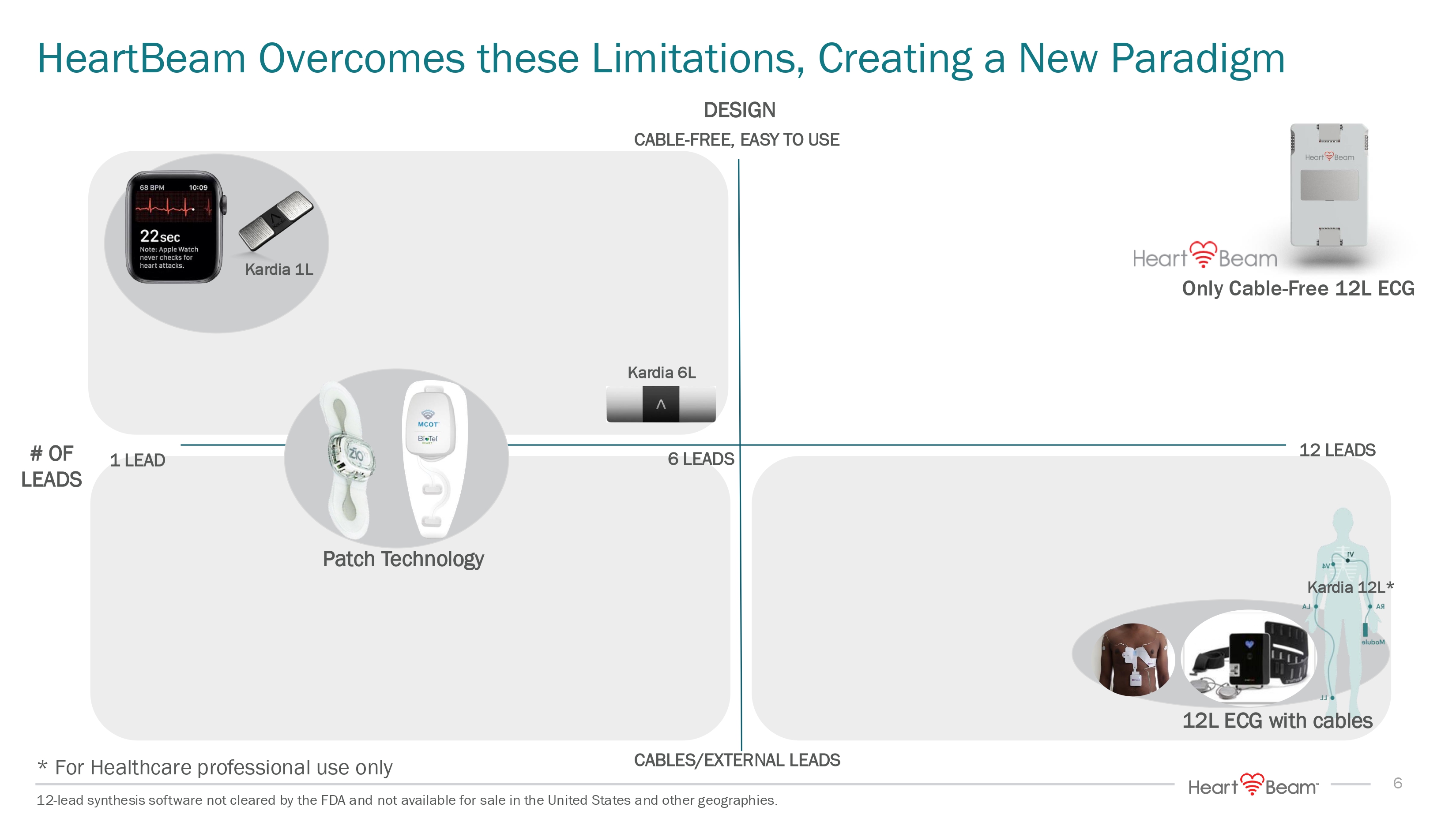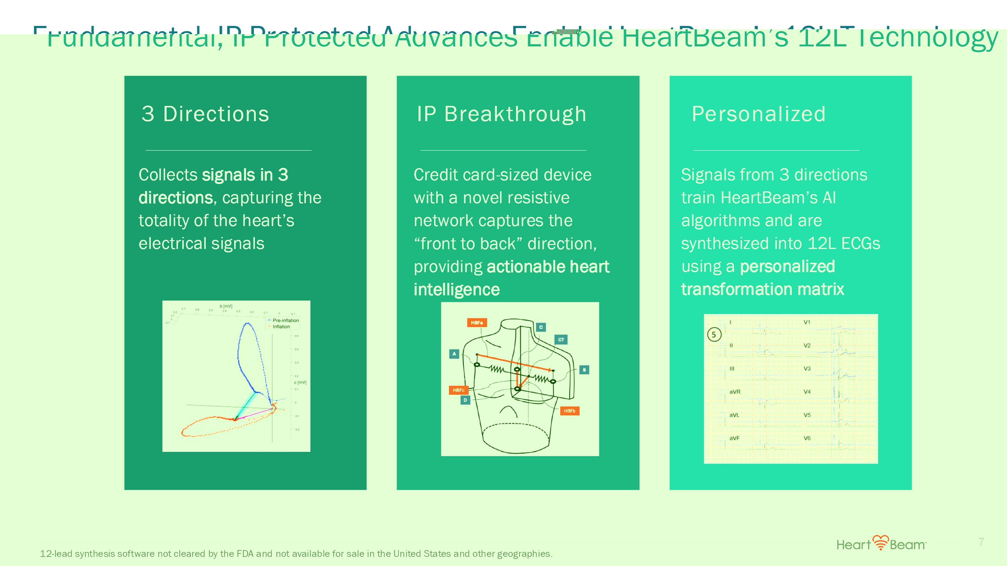 6 HeartBeam Overcomes these Limitations, Creating a New Paradigm # OF LEADS 1 LEAD 12 LEADS DESIGN CABLE - FREE, EASY TO USE CABLES/EXTERNAL LEADS 6 LEADS * For Healthcare professional use only 12L ECG with cables Kardia 6L Patch Technology Kardia 1L Kardia 12L* Only Cable - Free 12L ECG 12 - lead synthesis software not cleared by the FDA and n ot available for sale in the United States and other geographies.