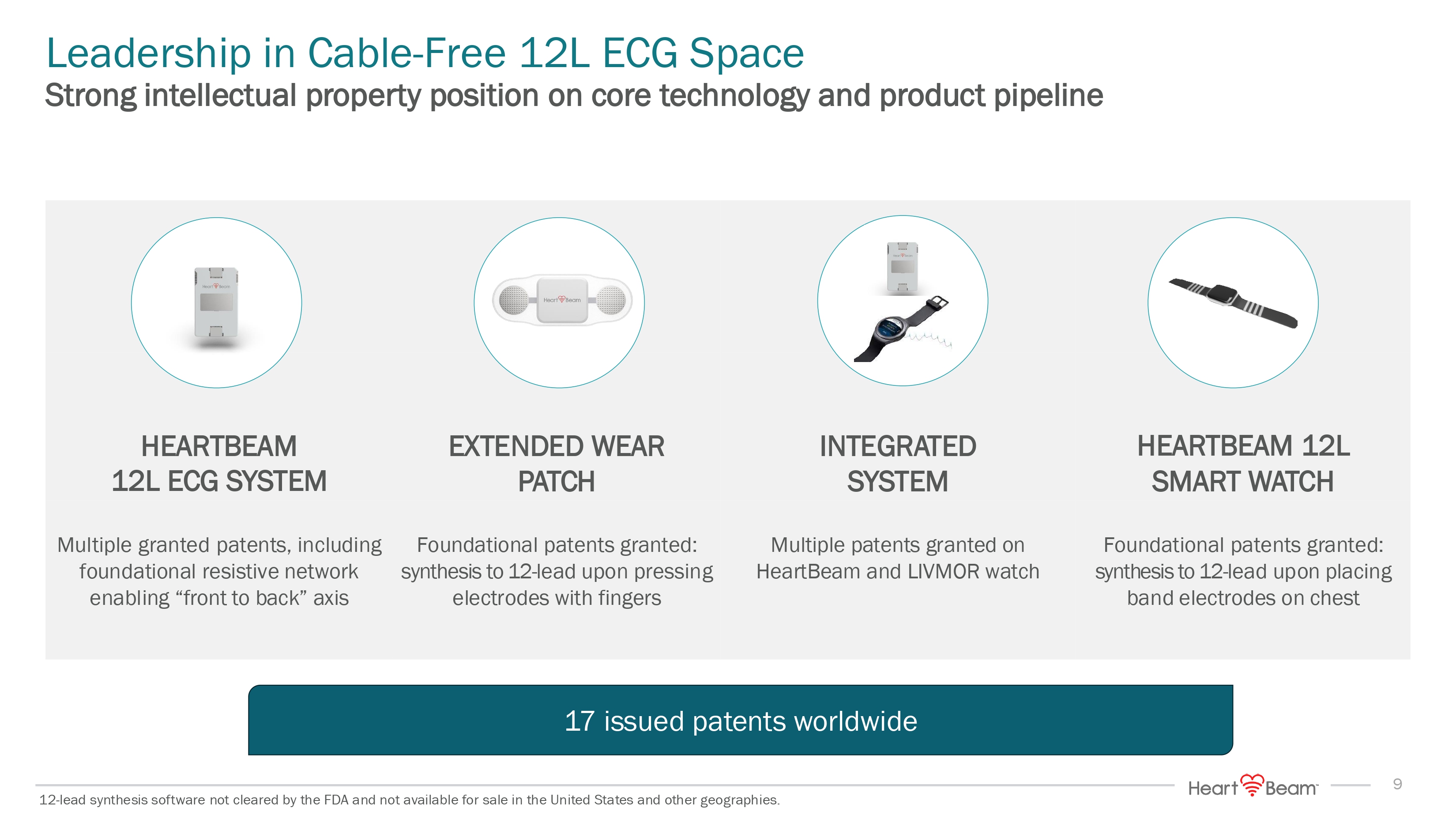 7 Fundamental, IP Protected Advances Enable HeartBeam’s 12L Technology IP Breakthrough Credit card - sized device with a novel resistive network captures the “front to back” direction, providing actionable heart intelligence 3 Directions Collects signals in 3 directions , capturing the totality of the heart’s electrical signals Personalized Signals from 3 directions train HeartBeam’s AI algorithms and are synthesized into 12L ECGs using a personalized transformation matrix 12 - lead synthesis software not cleared by the FDA and n ot available for sale in the United States and other geographies.