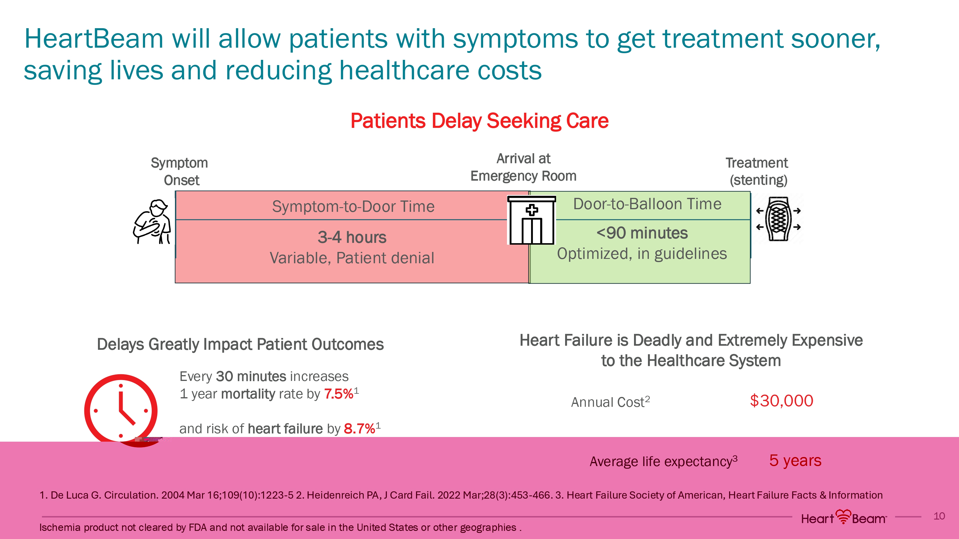 10 HeartBeam will allow patients with symptoms to get treatment sooner, saving lives and reducing healthcare costs Patients Delay Seeking Care Symptom Onset Arrival at Emergency Room Treatment (stenting) Symptom - to - Door Time Door - to - Balloon Time 3 - 4 hours Variable, Patient denial <90 minutes Optimized, in guidelines Delays Greatly Impact Patient Outcomes Every 30 minutes increases 1 year mortality rate by 7.5% 1 and risk of heart failure by 8.7% 1 Heart Failure is Deadly and Extremely Expensive to the Healthcare System Annual Cost 2 $30,000 Average life expectancy 3 5 years 1. De Luca G. Circulation. 2004 Mar 16;109(10):1223 - 5 2. Heidenreich PA, J Card Fail. 2022 Mar;28(3):453 - 466. 3. Heart Failure S ociety of American, Heart Failure Facts & Information Ischemia product not cleared by FDA and n ot available for sale in the United States or other geographies .