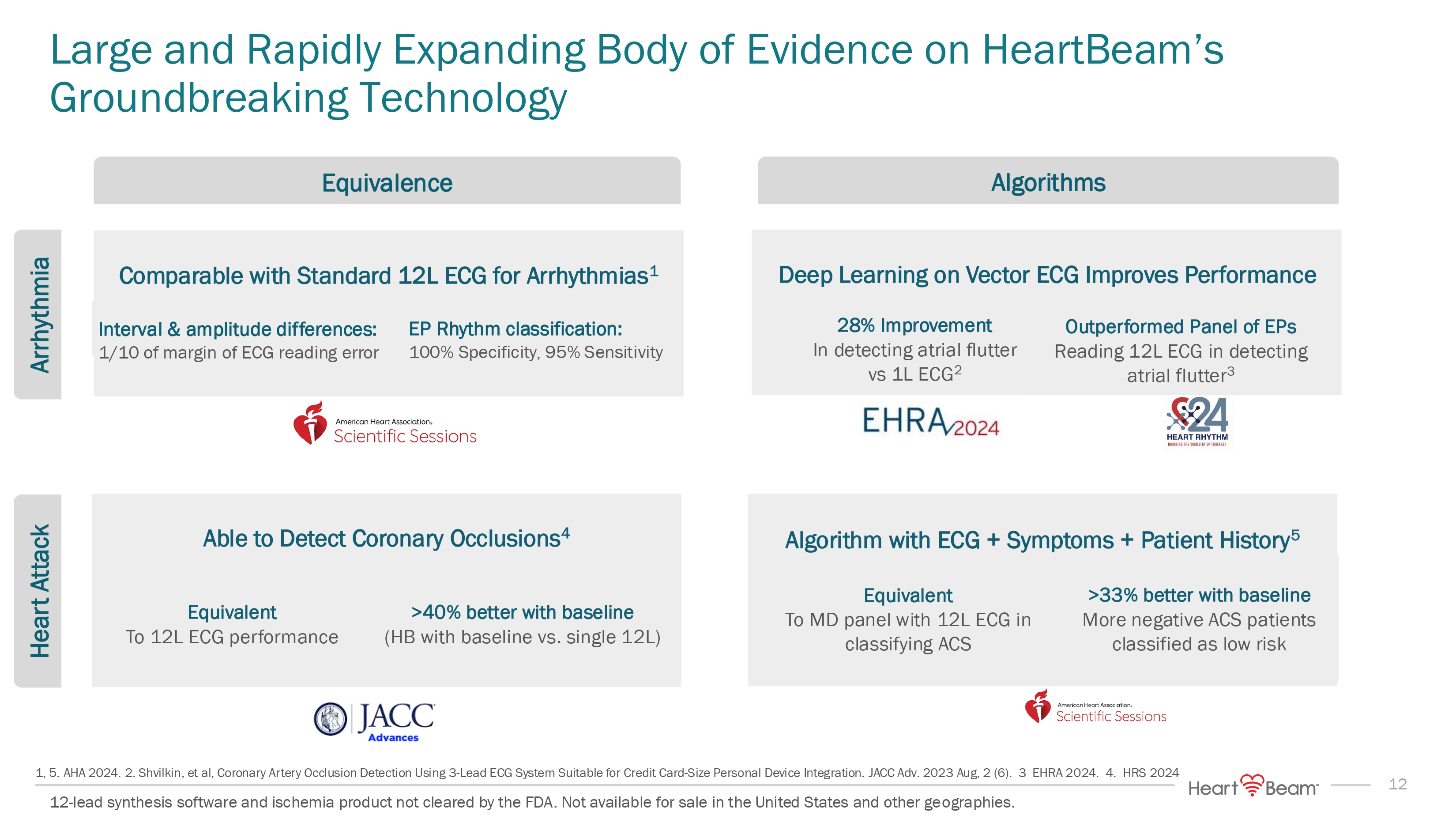 11 PATIENTS IN CLINICAL STUDIES 500+ USERS 250+ RECORDINGS 15,000+ Significant Body of Evidence on HeartBeam’s Groundbreaking Technology Equivalence to 12L for Coronary Occlusions HeartBeam AI + Vector ECG for Complex Arrhythmias Fundamentals of HeartBeam technology HeartBeam algorithm for Heart Attack vs Standard of Care PAPERS AND PRESENTATIONS 9 Equivalence to 12L ECG for Arrhythmia Strengthening evidence base per indication for use 12 - lead synthesis software and ischemia product not cleared by the FDA. Not available for sale in the United States and other ge ographies.