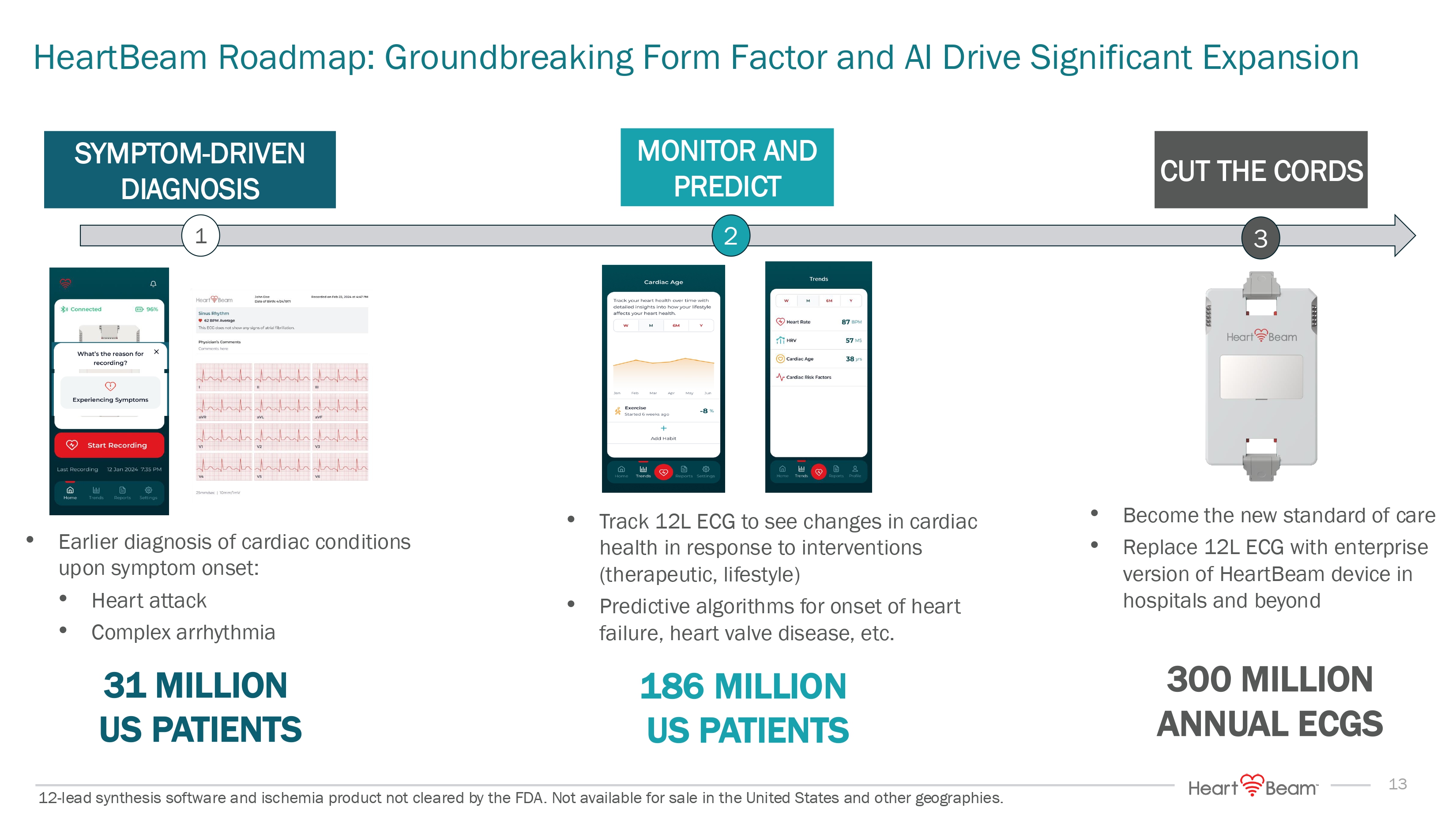 12 Large and Rapidly Expanding Body of Evidence on HeartBeam’s Groundbreaking Technology 12 - lead synthesis software and ischemia product not cleared by the FDA. Not available for sale in the United States and other ge ographies. 1, 5. AHA 2024. 2. Shvilkin, et al, Coronary Artery Occlusion Detection Using 3 - Lead ECG System Suitable for Credit Card - Size Pe rsonal Device Integration. JACC Adv. 2023 Aug, 2 (6). 3 EHRA 2024. 4. HRS 2024 Comparable with Standard 12L ECG for Arrhythmias 1 Interval & amplitude differences: 1/10 of margin of ECG reading error EP Rhythm classification: 100% Specificity, 95% Sensitivity Arrhythmia Heart Attack Equivalence Algorithms Able to Detect Coronary Occlusions 4 Equivalent To 12L ECG performance >40% better with baseline (HB with baseline vs. single 12L) Deep Learning on Vector ECG Improves Performance 28% Improvement In detecting atrial flutter vs 1L ECG 2 Outperformed Panel of EPs Reading 12L ECG in detecting atrial flutter 3 Algorithm with ECG + Symptoms + Patient History 5 Equivalent To MD panel with 12L ECG in classifying ACS >33% better with baseline More negative ACS patients classified as low risk