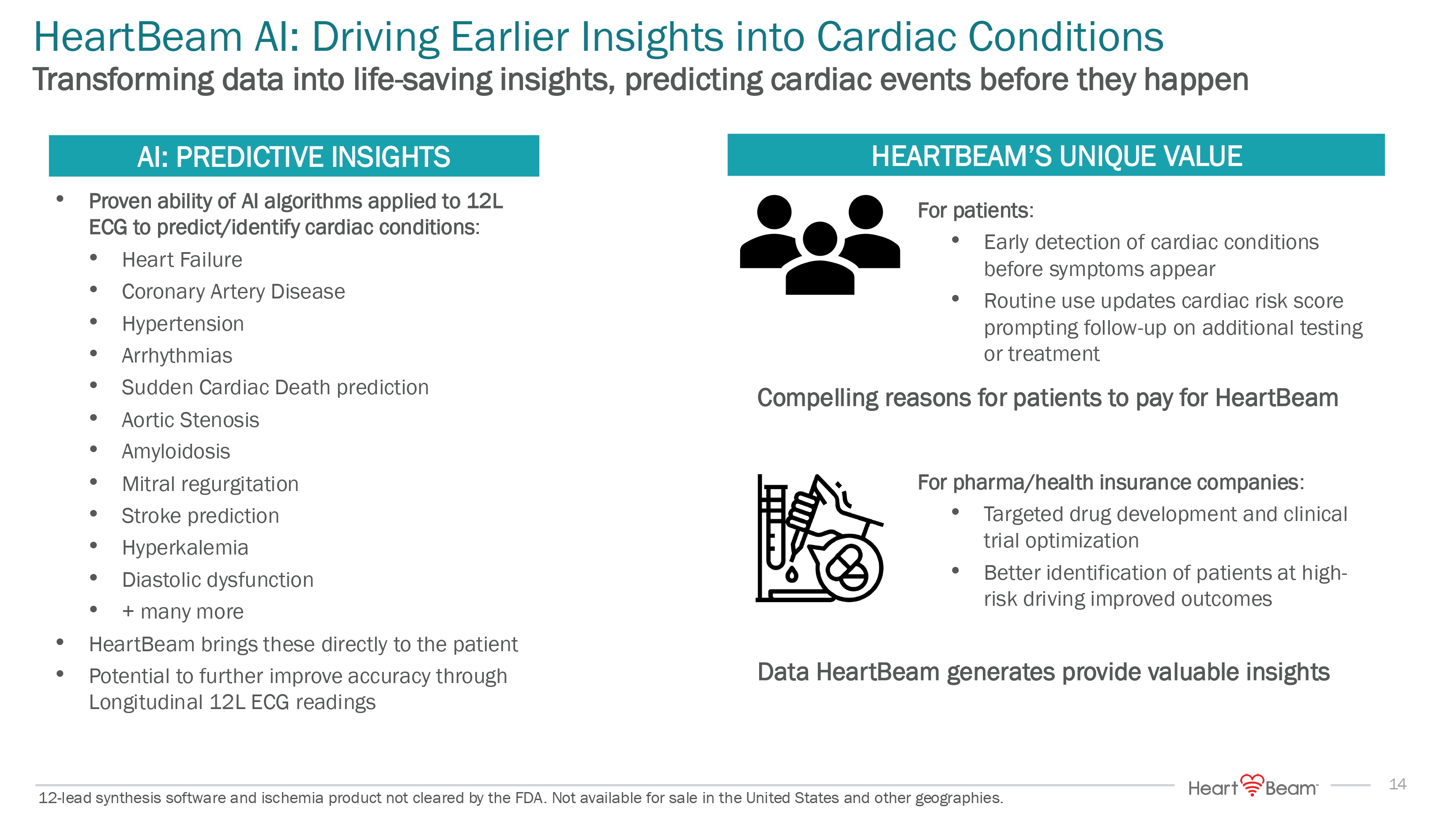 13 HeartBeam Roadmap: Groundbreaking Form Factor and AI Drive Significant Expansion 12 - lead synthesis software and ischemia product not cleared by the FDA. Not available for sale in the United States and other ge ographies. 31 MILLION US PATIENTS 186 MILLION US PATIENTS 300 MILLION ANNUAL ECGS 1 2 3 SYMPTOM - DRIVEN DIAGNOSIS MONITOR AND PREDICT CUT THE CORDS • Earlier diagnosis of cardiac conditions upon symptom onset: • Heart attack • Complex arrhythmia • Track 12L ECG to see changes in cardiac health in response to interventions (therapeutic, lifestyle) • Predictive algorithms for onset of heart failure, heart valve disease, etc. • Become the new standard of care • Replace 12L ECG with enterprise version of HeartBeam device in h ospitals and beyond