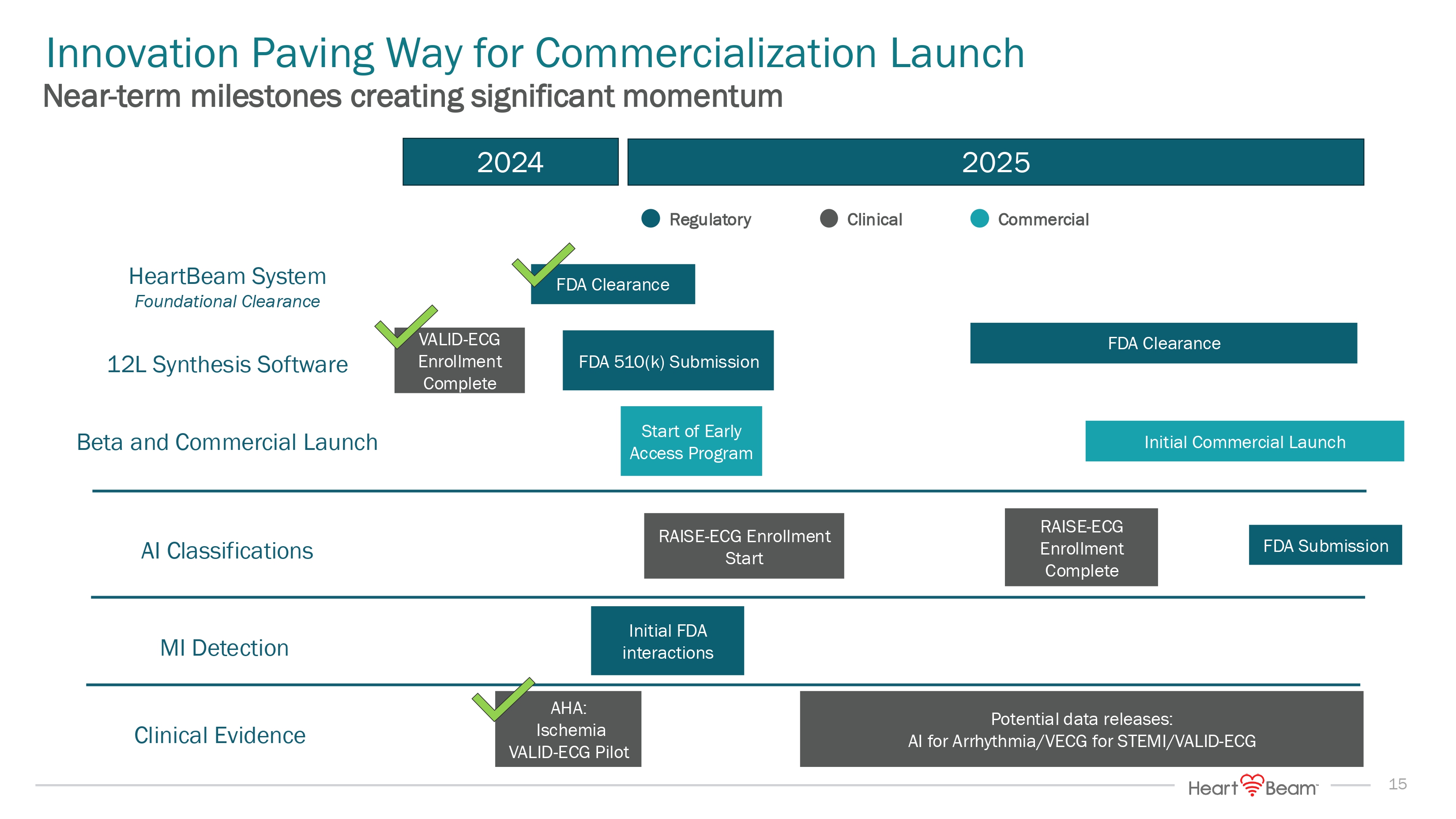 14 HeartBeam AI: Driving Earlier Insights into Cardiac Conditions Transforming data into life - saving insights, predicting cardiac events before they happen 12 - lead synthesis software and ischemia product not cleared by the FDA. Not available for sale in the United States and other ge ographies. AI: PREDICTIVE INSIGHTS HEARTBEAM’S UNIQUE VALUE • Proven ability of AI algorithms applied to 12L ECG to predict/identify cardiac conditions : • Heart Failure • Coronary Artery Disease • Hypertension • Arrhythmias • Sudden Cardiac D eath prediction • Aortic Stenosis • Amyloidosis • Mitral regurgitation • Stroke prediction • Hyperkalemia • Diastolic dysfunction • + many more • HeartBeam brings these directly to the patient • Potential to further improve accuracy through Longitudinal 12L ECG readings For patients : • Early detection of cardiac conditions before symptoms appear • Routine use updates cardiac risk score prompting follow - up on additional testing or treatment For pharma/health insurance companies : • Targeted drug development and clinical trial optimization • Better identification of patients at high - risk driving improved outcomes Compelling reasons for patients to pay for HeartBeam Data HeartBeam generates provide valuable insights