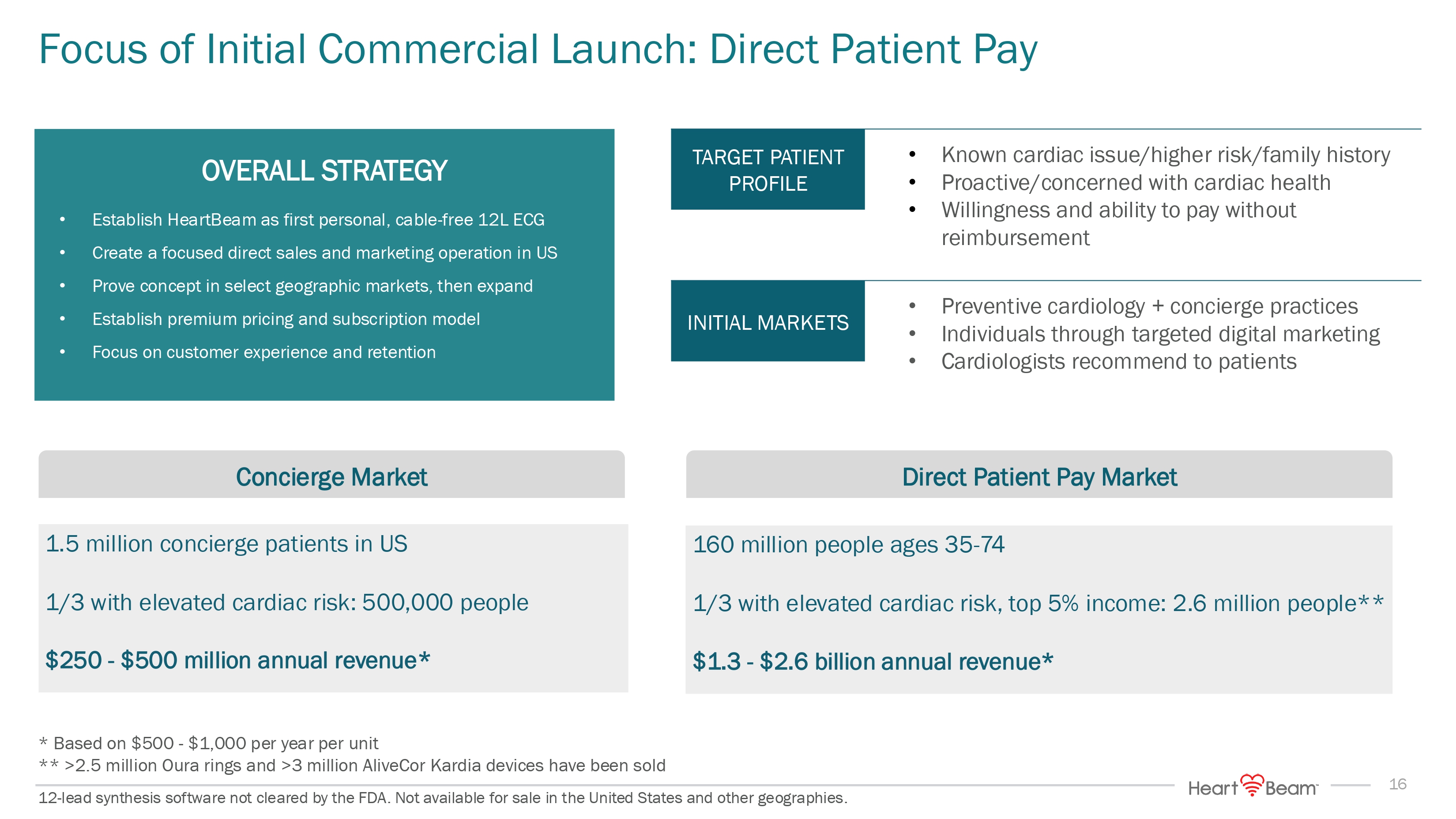 15 Near - term milestones creating significant momentum HeartBeam System Foundational Clearance MI Detection AI Classifications Clinical Commercial Regulatory Initial FDA interactions RAISE - ECG Enrollment Complete FDA Submission Start of Early Access Program FDA Clearance 12L Synthesis Software FDA Clearance Beta and Commercial Launch Initial Commercial Launch Innovation Paving Way for Commercialization Launch 2024 2025 RAISE - ECG Enrollment Start FDA 510(k) Submission Clinical Evidence AHA: Ischemia VALID - ECG Pilot Potential data releases: AI for Arrhythmia/VECG for STEMI/VALID - ECG VALID - ECG Enrollment Complete