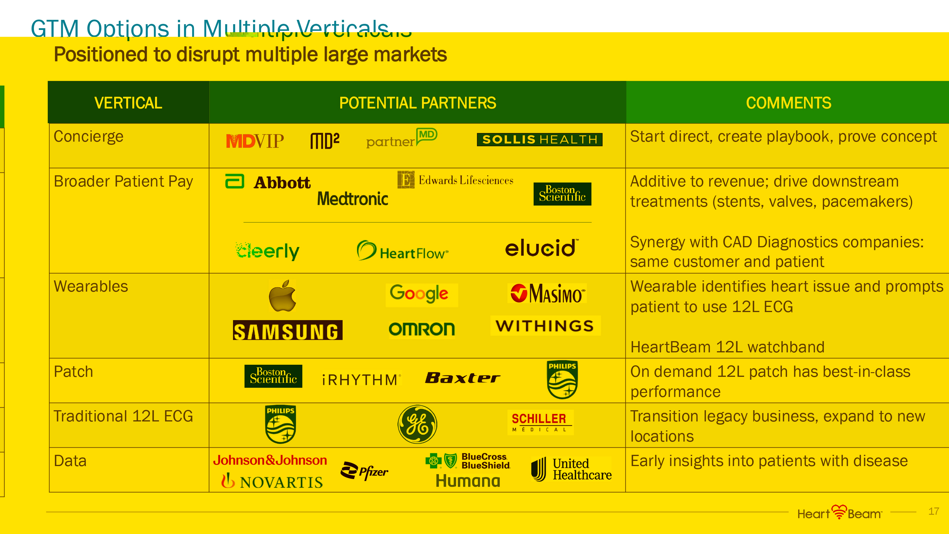 16 Focus of Initial Commercial Launch: Direct Patient Pay • Establish HeartBeam as first personal, cable - free 12L ECG • Create a focused direct sales and marketing operation in US • Prove concept in select geographic markets, then expand • Establish premium pricing and subscription model • Focus on customer experience and retention OVERALL STRATEGY • Known cardiac issue/higher risk/family history • Proactive/concerned with cardiac health • Willingness and ability to pay without reimbursement • Preventive cardiology + concierge practices • Individuals through targeted digital marketing • Cardiologists recommend to patients INITIAL MARKETS TARGET PATIENT PROFILE 1.5 million concierge patients in US 1/3 with elevated cardiac risk: 500,000 people $250 - $500 million annual revenue* Concierge Market 160 million people ages 35 - 74 1/3 with elevated cardiac risk, top 5% income: 2.6 million people** $1.3 - $2.6 billion annual revenue* Direct Patient Pay Market * Based on $500 - $1,000 per year per unit ** >2.5 million Oura rings and >3 million AliveCor Kardia devices have been sold 12 - lead synthesis software not cleared by the FDA. Not available for sale in the United States and other geographies.
