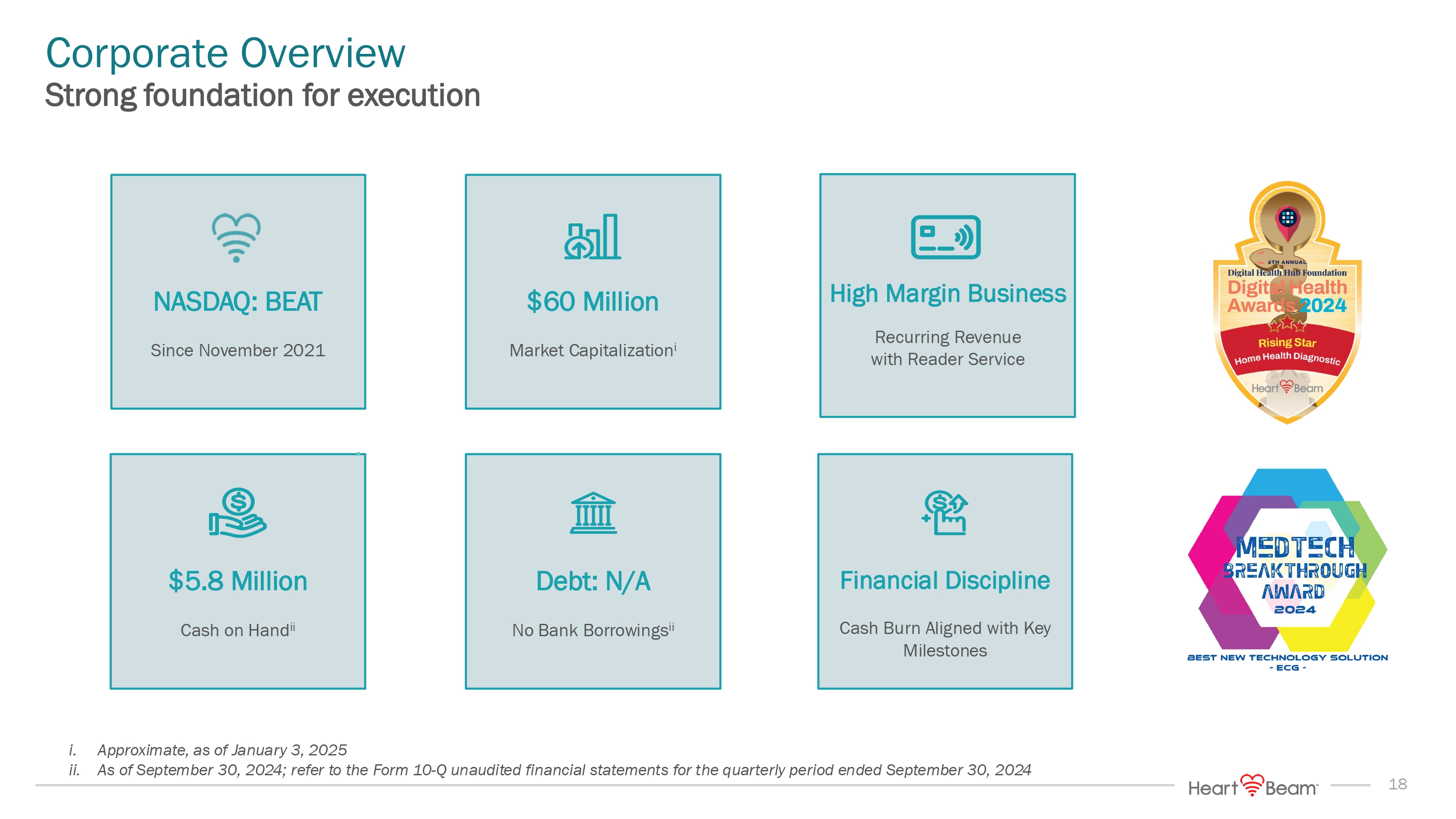 17 Start direct, create playbook, prove concept Concierge Additive to revenue; drive downstream treatments (stents, valves, pacemakers) Synergy with CAD Diagnostics companies: same customer and patient Broader Patient Pay Wearable identifies heart issue and prompts patient to use 12L ECG HeartBeam 12L watchband Wearables On demand 12L patch has best - in - class performance Patch Transition legacy business, expand to new locations Traditional 12L ECG Early insights into patients with disease Data GTM Options in Multiple Verticals Positioned to disrupt multiple large markets VERTICAL COMMENTS POTENTIAL PARTNERS