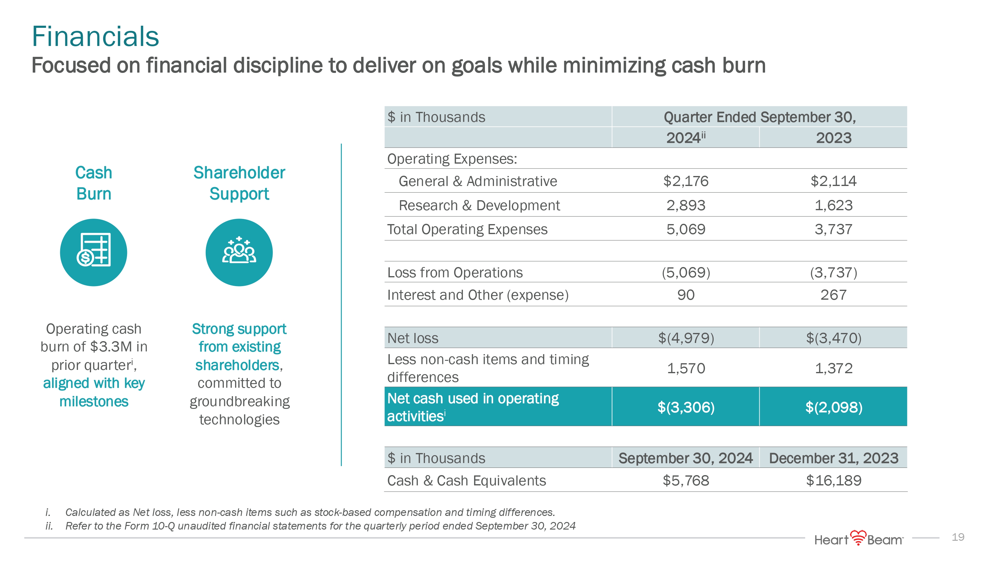 18 Financial Discipline Cash Burn Aligned with Key Milestones Strong foundation for execution Corporate Overview i. Approximate, as of January 3, 2025 ii. As of September 30, 2024; refer to the Form 10 - Q unaudited financial statements for the quarterly period ended September 30, 202 4 $5.8 Million Cash on Hand ii Debt: N/A No Bank Borrowings ii $60 Million Market Capitalization i High Margin Business Recurring Revenue with Reader Service NASDAQ: BEAT Since November 2021