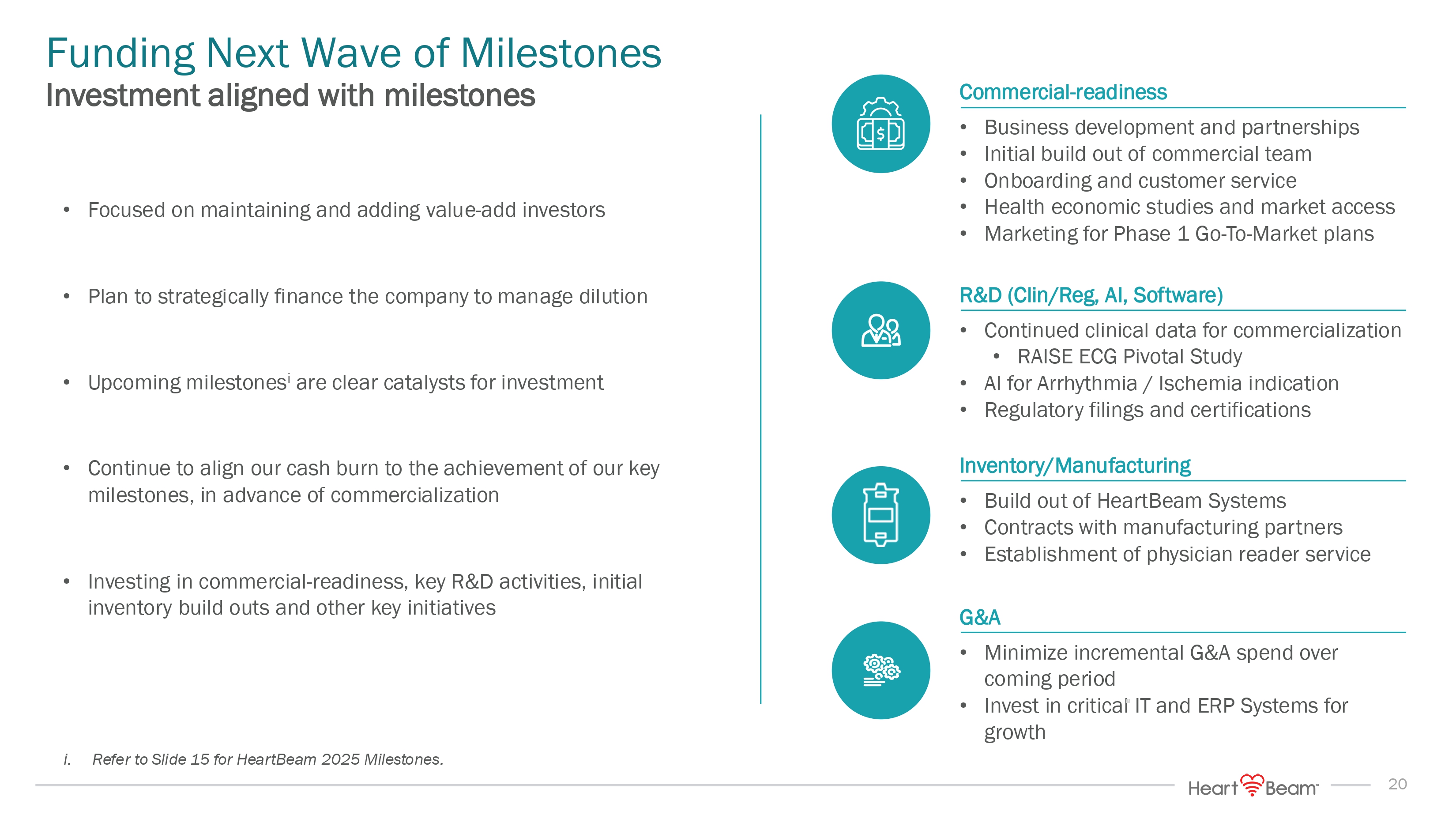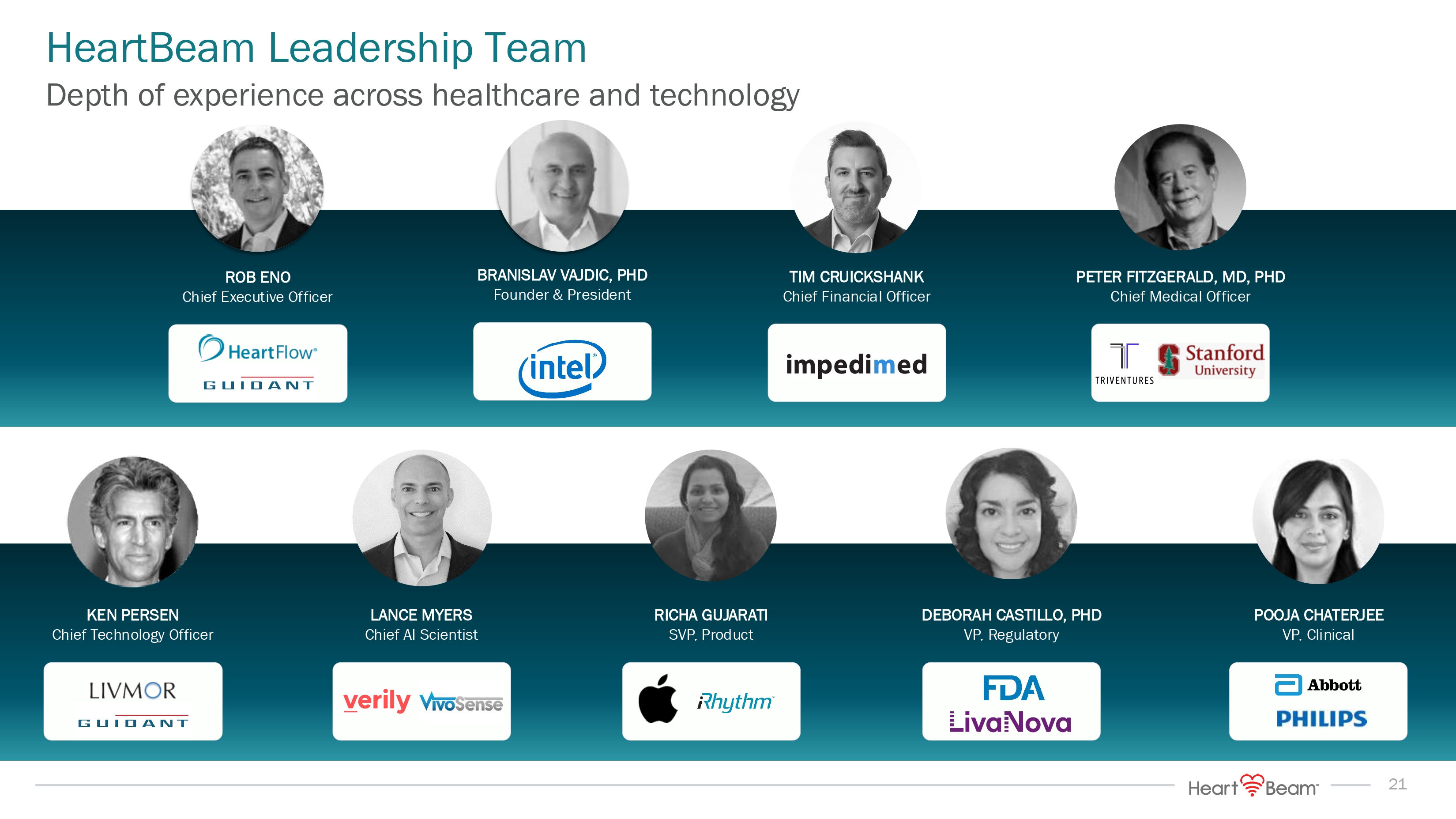 20 Investment aligned with milestones Funding Next Wave of Milestones i. Refer to Slide 15 for HeartBeam 2025 Milestones. Commercial - readiness • Business development and partnerships • Initial build out of commercial team • Onboarding and customer service • Health economic studies and market access • Marketing for Phase 1 Go - To - Market plans R&D (Clin/Reg, AI, Software) • Continued clinical data for commercialization • RAISE ECG Pivotal Study • AI for Arrhythmia / Ischemia indication • Regulatory filings and certifications Inventory/Manufacturing • Build out of HeartBeam Systems • Contracts with manufacturing partners • Establishment of physician reader service G&A • Minimize incremental G&A spend over coming period • Invest in critical IT and ERP Systems for growth • Focused on maintaining and adding value - add investors • Plan to strategically finance the company to manage dilution • Upcoming milestones i are clear catalysts for investment • Continue to align our cash burn to the achievement of our key milestones, in advance of commercialization • Investing in commercial - readiness, key R&D activities, initial inventory build outs and other key initiatives