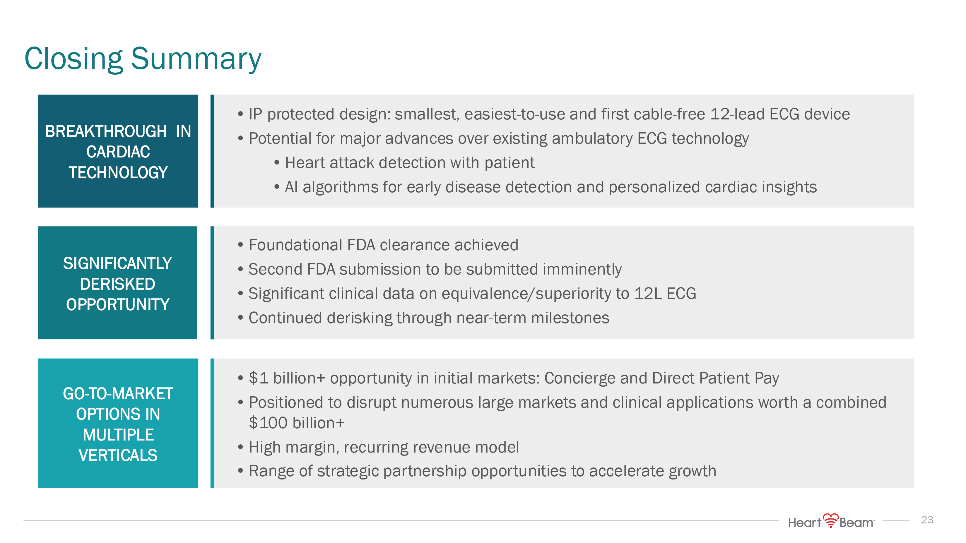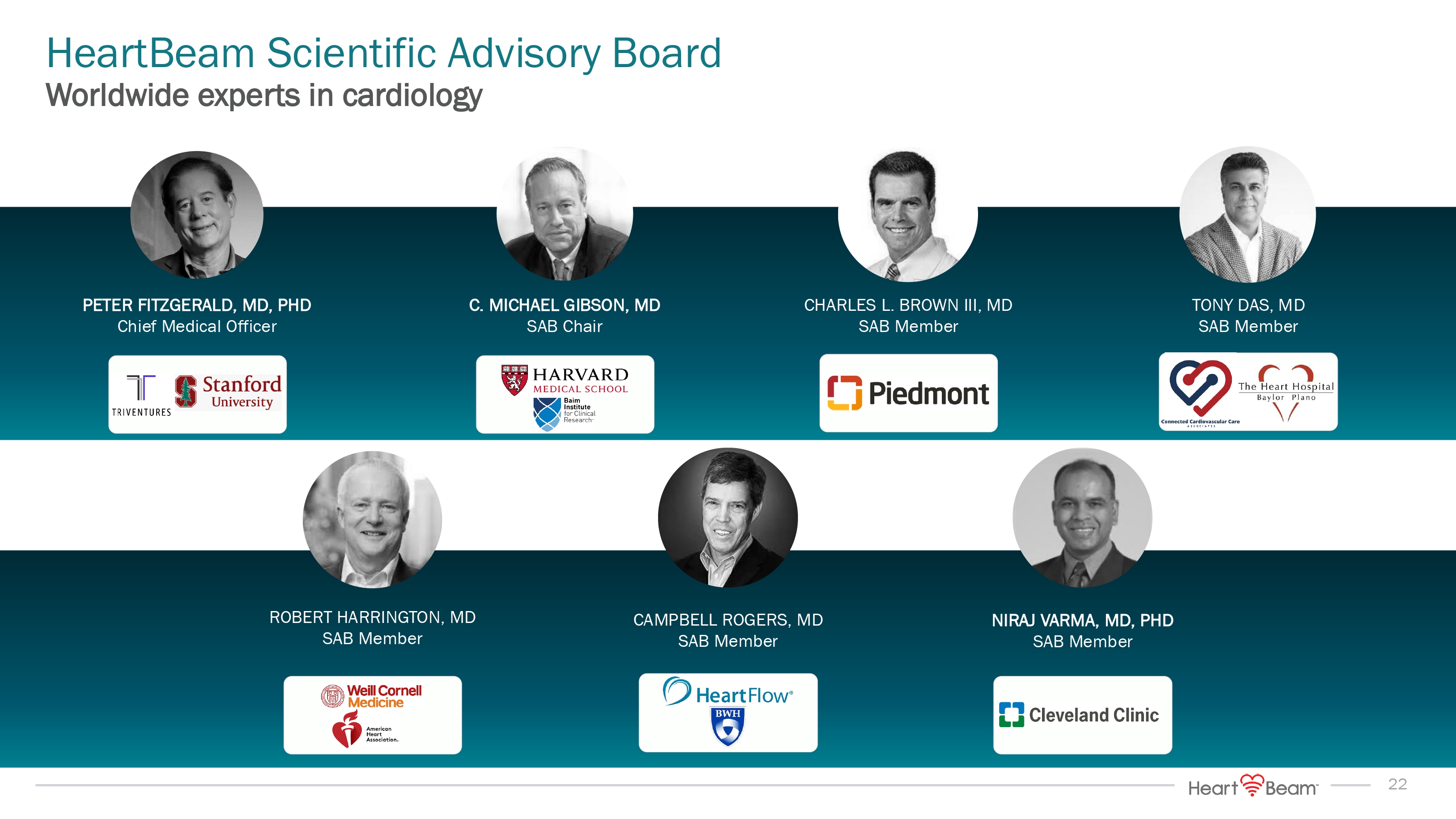 21 BRANISLAV VAJDIC, PHD Founder & President KEN PERSEN Chief Technology Officer PETER FITZGERALD, MD, PHD Chief Medical Officer DEBORAH CASTILLO, PHD VP, Regulatory POOJA CHATERJEE VP, Clinical RICHA GUJARATI SVP, Product TIM CRUICKSHANK Chief Financial Officer HeartBeam Leadership Team LANCE MYERS Chief AI Scientist Depth of experience across healthcare and technology ROB ENO Chief Executive Officer