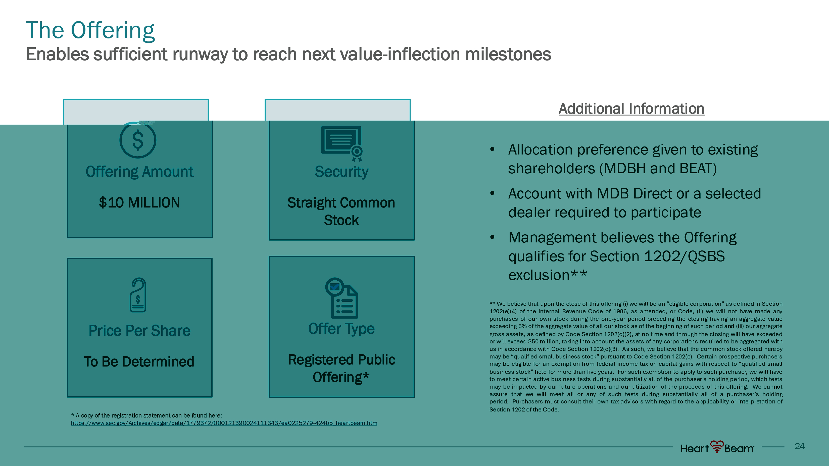 24 Enables sufficient runway to reach next value - inflection milestones The Offering Price Per Share To Be Determined Offer Type Registered Public Offering* Security Straight Common Stock Offering Amount $10 MILLION * A copy of the registration statement can be found here: https://www.sec.gov/Archives/edgar/data/1779372/000121390024111343/ea0225279 - 424b5_heartbeam.htm Additional Information • Allocation preference given to existing shareholders (MDBH and BEAT) • Account with MDB Direct or a selected dealer required to participate • Management believes the Offering qualifies for Section 1202/QSBS exclusion** ** We believe that upon the close of this offering ( i ) we will be an “eligible corporation” as defined in Section 1202 (e)( 4 ) of the Internal Revenue Code of 1986 , as amended, or Code, (ii) we will not have made any purchases of our own stock during the one - year period preceding the closing having an aggregate value exceeding 5 % of the aggregate value of all our stock as of the beginning of such period and (iii) our aggregate gross assets, as defined by Code Section 1202 (d)( 2 ), at no time and through the closing will have exceeded or will exceed $ 50 million, taking into account the assets of any corporations required to be aggregated with us in accordance with Code Section 1202 (d)( 3 ) . As such, we believe that the common stock offered hereby may be “qualified small business stock” pursuant to Code Section 1202 (c) . Certain prospective purchasers may be eligible for an exemption from federal income tax on capital gains with respect to “qualified small business stock” held for more than five years . For such exemption to apply to such purchaser, we will have to meet certain active business tests during substantially all of the purchaser’s holding period, which tests may be impacted by our future operations and our utilization of the proceeds of this offering . We cannot assure that we will meet all or any of such tests during substantially all of a purchaser’s holding period . Purchasers must consult their own tax advisors with regard to the applicability or interpretation of Section 1202 of the Code .