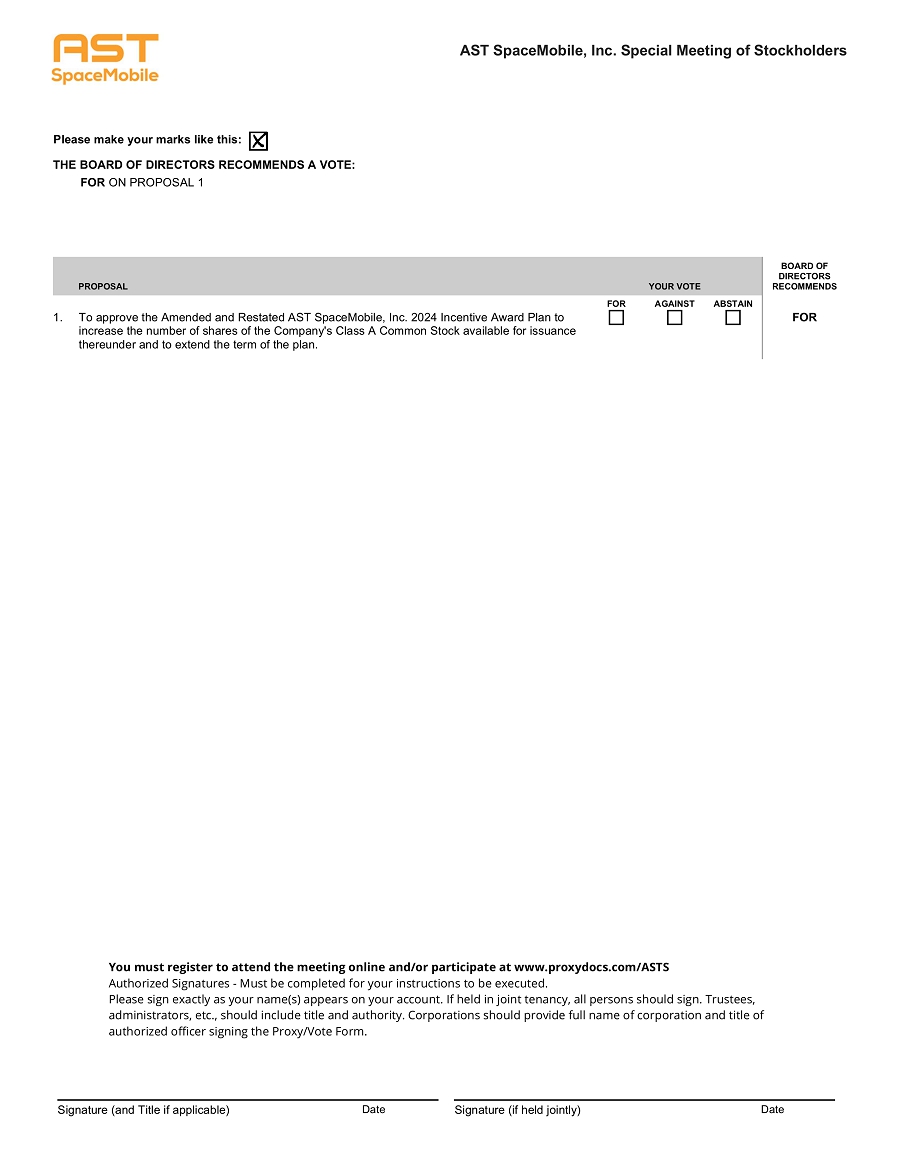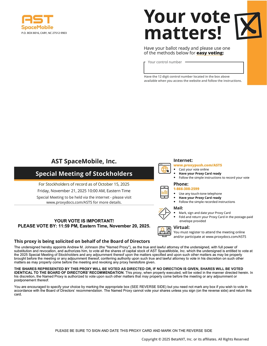I cordially invite you to attend the Special Meeting of Stockholders (the “Special Meeting”) of AST SpaceMobile, Inc., which will be held online via live internet webcast on Friday, November 21, 2025, at 10:00 a.m., Eastern Time. To participate in the Special Meeting, you must register at www.proxydocs.com/ASTS before 9:30 a.m., Eastern Time on Friday, November 21, 2025. After completion of your registration by the registration deadline, further instructions, including a unique link to access the Special Meeting, will be emailed to you.
