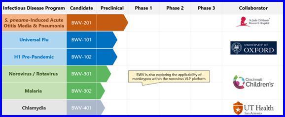 We seek to develop vaccines that provide long-lasting immunity to harmful viral and bacterial pathogens that cause infections in patient populations with high unmet needs. Our most advanced vaccine candidate is a live-attenuated, intranasally delivered, serotype independent Streptococcus pneumoniae vaccine to prevent middle ear infections, also known as acute otitis media (“AOM”), and pneumococcal pneumonia. AOM is a significant burden globally, particularly in young children, and pneumococcal pneumonia primarily impacts the elderly population. Additionally, we believe that this attenuated bacterium can serve as a platform to protect against other infectious agents that cause acute otitis media, such as non-typeable Haemophilus influenzae and Moraxella catarrhalis, by anchoring antigens from these pathogens on the surface of BWV-201, our attenuated Streptococcus pneumoniae bacterial vaccine. We hold a global, exclusive license to this technology, which was generated from the laboratory of Jason Rosch, Ph.D., of St. Jude Children’s Research Hospital. Our influenza programs are based on technology developed by Sunetra Gupta, Ph.D. at the University of Oxford, for which we hold a global, exclusive license for use of epitopes of limited variability, ELVs, to develop novel influenza vaccine candidates. Identified through a proprietary computational research and discovery process, we believe a vaccine formulated with these epitopes from different influenza strains will produce a viable universal influenza vaccine candidate. We are exploring the development of these influenza ELVs utilizing our norovirus shell and protrusion (“S&P”) nanoparticle vaccine platform, licensed from Cincinnati Children’s Hospital Medical Center, or CHMC. We are also utilizing this platform to develop a vaccine for the prevention of gastroenteritis caused by norovirus or rotavirus, as well as novel vaccines for malaria and monkeypox. The final candidate in our vaccine pipeline is a live-attenuated, orally delivered vaccine to prevent Chlamydia, for which we have a global, exclusive license to this technology originated from the University of Texas Health at San Antonio. We leverage the expertise of each of our collaborators to pursue the discovery and development of vaccines for these diseases, each of which represent high unmet needs globally.