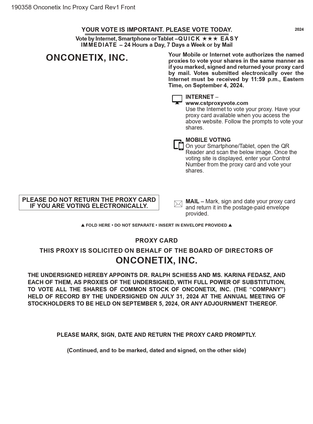 The accompanying proxy statement incorporates important business and financial information about Onconetix from other documents that Onconetix has filed with the U.S. Securities and Exchange Commission (“SEC”) and that are not contained in and are instead incorporated by reference in the accompanying proxy statement. For a list of documents incorporated by reference in the accompanying proxy statement, see “Where You Can Find More Information.” This information is available for you, without charge, to review through the SEC’s website at www.sec.gov.