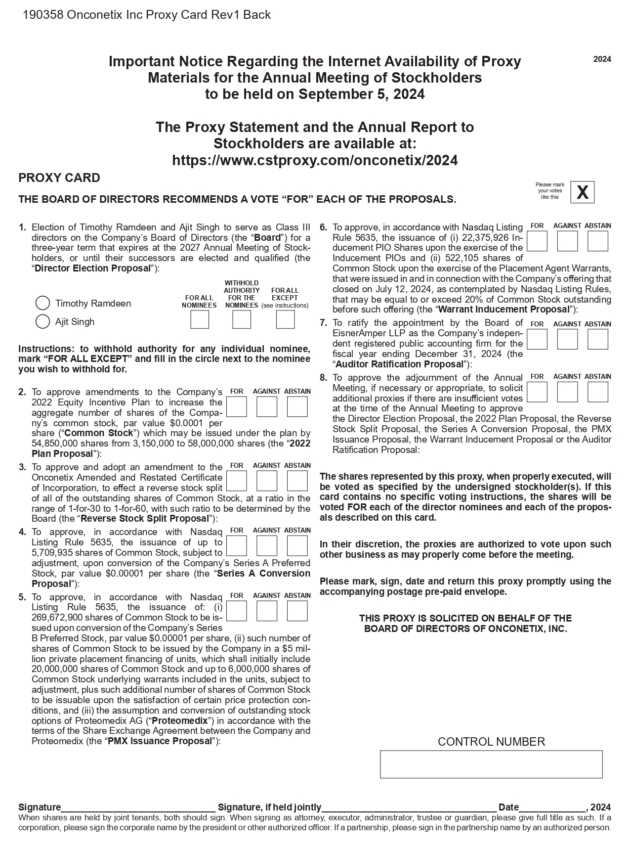 The Proposals are described in the accompanying proxy statement, which we encourage you to read in its entirety before voting. Only holders of record of Common Stock at the close of business on July 31, 2024 are entitled to notice of the Annual Meeting and to vote and have their votes counted at the Annual Meeting and any adjournments or postponements of the Annual Meeting. A complete list of Onconetix stockholders of record entitled to vote at the Annual Meeting will be available for ten days before the Annual Meeting at the principal executive offices of Onconetix for inspection by stockholders during ordinary business hours for any purpose germane to the Annual Meeting.