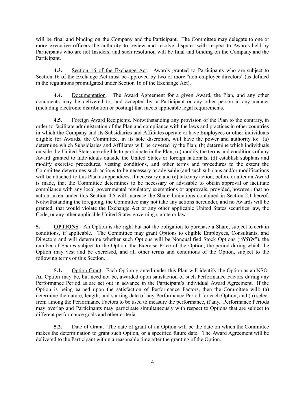 will be final and binding on the Company and the Participant. The Committee may delegate to one or more executive officers the authority to review and resolve disputes with respect to Awards held by Participants who are not Insiders, and such resolution will be final and binding on the Company and the Participant. 4.3. Section 16 of the Exchange Act. Awards granted to Participants who are subject to Section 16 of the Exchange Act must be approved by two or more “non-employee directors” (as defined in the regulations promulgated under Section 16 of the Exchange Act). 4.4. Documentation. The Award Agreement for a given Award, the Plan, and any other documents may be delivered to, and accepted by, a Participant or any other person in any manner (including electronic distribution or posting) that meets applicable legal requirements. 4.5. Foreign Award Recipients. Notwithstanding any provision of the Plan to the contrary, in order to facilitate administration of the Plan and compliance with the laws and practices in other countries in which the Company and its Subsidiaries and Affiliates operate or have Employees or other individuals eligible for Awards, the Committee, in its sole discretion, will have the power and authority to: (a) determine which Subsidiaries and Affiliates will be covered by the Plan; (b) determine which individuals outside the United States are eligible to participate in the Plan; (c) modify the terms and conditions of any Award granted to individuals outside the United States or foreign nationals; (d) establish subplans and modify exercise procedures, vesting conditions, and other terms and procedures to the extent the Committee determines such actions to be necessary or advisable (and such subplans and/or modifications will be attached to this Plan as appendices, if necessary); and (e) take any action, before or after an Award is made, that the Committee determines to be necessary or advisable to obtain approval or facilitate compliance with any local governmental regulatory exemptions or approvals, provided, however, that no action taken under this Section 4.5 will increase the Share limitations contained in Section 2.1 hereof. Notwithstanding the foregoing, the Committee may not take any actions hereunder, and no Awards will be granted, that would violate the Exchange Act or any other applicable United States securities law, the Code, or any other applicable United States governing statute or law. 5. OPTIONS. An Option is the right but not the obligation to purchase a Share, subject to certain conditions, if applicable. The Committee may grant Options to eligible Employees, Consultants, and Directors and will determine whether such Options will be Nonqualified Stock Options (“NSOs”), the number of Shares subject to the Option, the Exercise Price of the Option, the period during which the Option may vest and be exercised, and all other terms and conditions of the Option, subject to the following terms of this Section. 5.1. Option Grant. Each Option granted under this Plan will identify the Option as an NSO. An Option may be, but need not be, awarded upon satisfaction of such Performance Factors during any Performance Period as are set out in advance in the Participant’s individual Award Agreement. If the Option is being earned upon the satisfaction of Performance Factors, then the Committee will: (a) determine the nature, length, and starting date of any Performance Period for each Option; and (b) select from among the Performance Factors to be used to measure the performance, if any. Performance Periods may overlap and Participants may participate simultaneously with respect to Options that are subject to different performance goals and other criteria. 5.2. Date of Grant. The date of grant of an Option will be the date on which the Committee makes the determination to grant such Option, or a specified future date. The Award Agreement will be delivered to the Participant within a reasonable time after the granting of the Option. 4