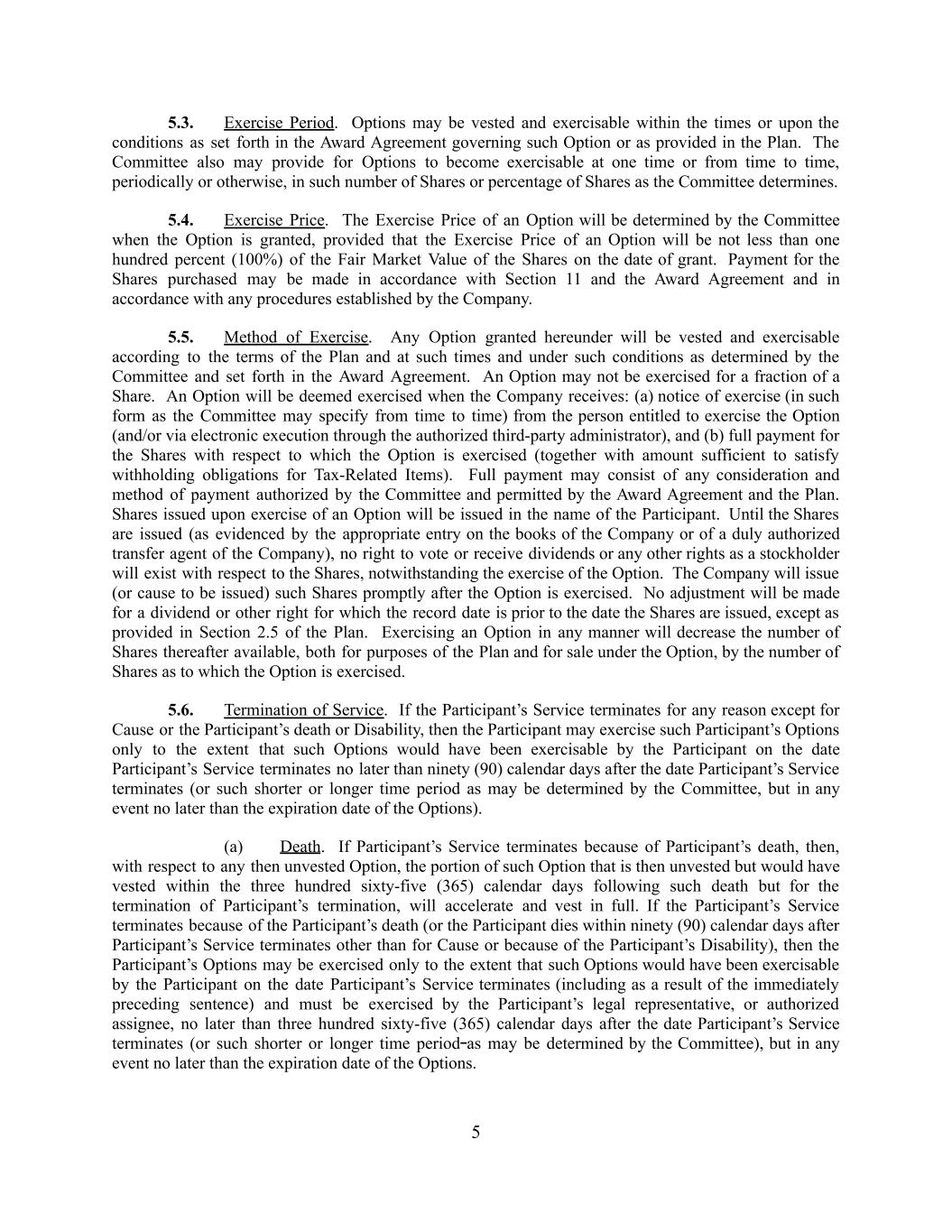 5.3. Exercise Period. Options may be vested and exercisable within the times or upon the conditions as set forth in the Award Agreement governing such Option or as provided in the Plan. The Committee also may provide for Options to become exercisable at one time or from time to time, periodically or otherwise, in such number of Shares or percentage of Shares as the Committee determines. 5.4. Exercise Price. The Exercise Price of an Option will be determined by the Committee when the Option is granted, provided that the Exercise Price of an Option will be not less than one hundred percent (100%) of the Fair Market Value of the Shares on the date of grant. Payment for the Shares purchased may be made in accordance with Section 11 and the Award Agreement and in accordance with any procedures established by the Company. 5.5. Method of Exercise. Any Option granted hereunder will be vested and exercisable according to the terms of the Plan and at such times and under such conditions as determined by the Committee and set forth in the Award Agreement. An Option may not be exercised for a fraction of a Share. An Option will be deemed exercised when the Company receives: (a) notice of exercise (in such form as the Committee may specify from time to time) from the person entitled to exercise the Option (and/or via electronic execution through the authorized third-party administrator), and (b) full payment for the Shares with respect to which the Option is exercised (together with amount sufficient to satisfy withholding obligations for Tax-Related Items). Full payment may consist of any consideration and method of payment authorized by the Committee and permitted by the Award Agreement and the Plan. Shares issued upon exercise of an Option will be issued in the name of the Participant. Until the Shares are issued (as evidenced by the appropriate entry on the books of the Company or of a duly authorized transfer agent of the Company), no right to vote or receive dividends or any other rights as a stockholder will exist with respect to the Shares, notwithstanding the exercise of the Option. The Company will issue (or cause to be issued) such Shares promptly after the Option is exercised. No adjustment will be made for a dividend or other right for which the record date is prior to the date the Shares are issued, except as provided in Section 2.5 of the Plan. Exercising an Option in any manner will decrease the number of Shares thereafter available, both for purposes of the Plan and for sale under the Option, by the number of Shares as to which the Option is exercised. 5.6. Termination of Service. If the Participant’s Service terminates for any reason except for Cause or the Participant’s death or Disability, then the Participant may exercise such Participant’s Options only to the extent that such Options would have been exercisable by the Participant on the date Participant’s Service terminates no later than ninety (90) calendar days after the date Participant’s Service terminates (or such shorter or longer time period as may be determined by the Committee, but in any event no later than the expiration date of the Options). (a) Death. If Participant’s Service terminates because of Participant’s death, then, with respect to any then unvested Option, the portion of such Option that is then unvested but would have vested within the three hundred sixty-five (365) calendar days following such death but for the termination of Participant’s termination, will accelerate and vest in full. If the Participant’s Service terminates because of the Participant’s death (or the Participant dies within ninety (90) calendar days after Participant’s Service terminates other than for Cause or because of the Participant’s Disability), then the Participant’s Options may be exercised only to the extent that such Options would have been exercisable by the Participant on the date Participant’s Service terminates (including as a result of the immediately preceding sentence) and must be exercised by the Participant’s legal representative, or authorized assignee, no later than three hundred sixty-five (365) calendar days after the date Participant’s Service terminates (or such shorter or longer time period as may be determined by the Committee), but in any event no later than the expiration date of the Options. 5