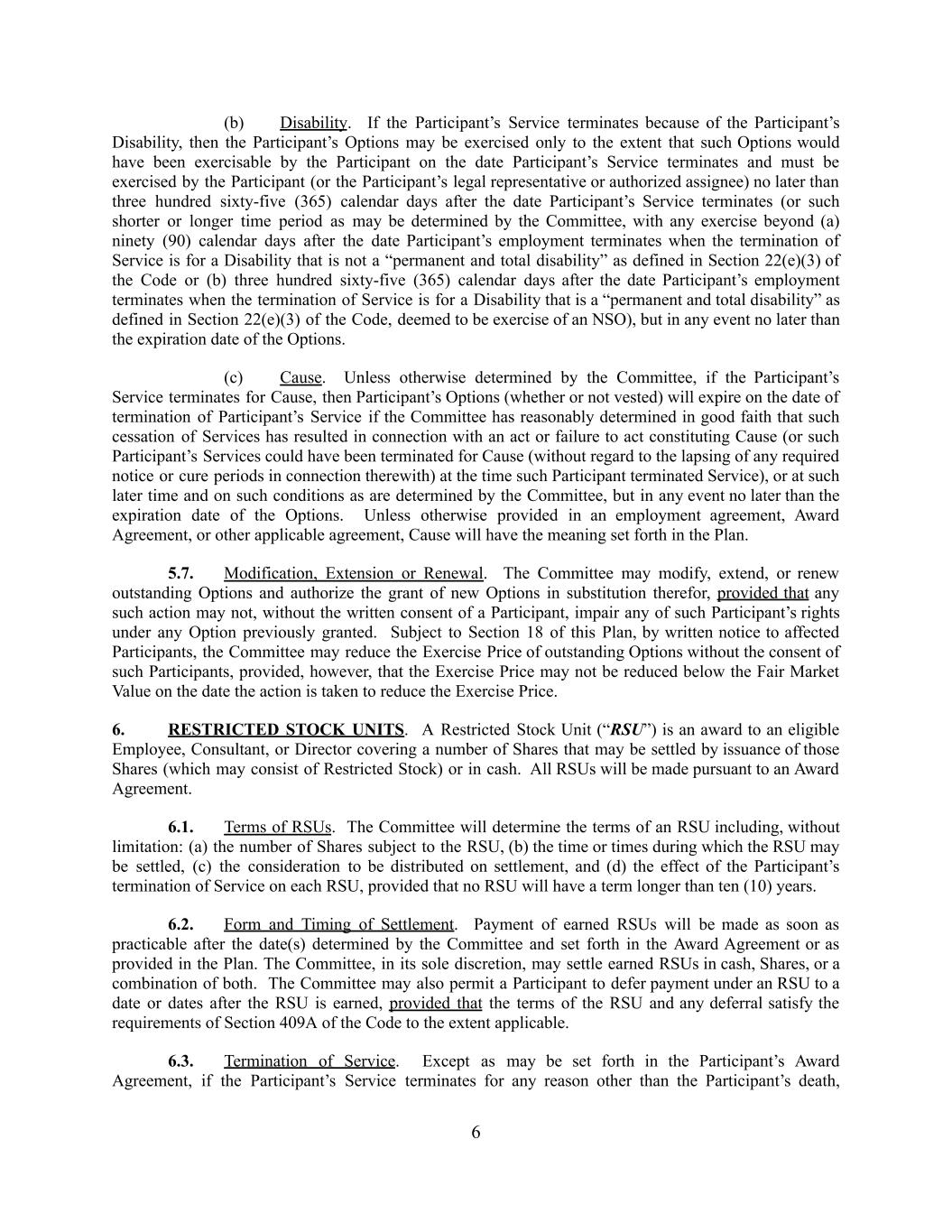 (b) Disability. If the Participant’s Service terminates because of the Participant’s Disability, then the Participant’s Options may be exercised only to the extent that such Options would have been exercisable by the Participant on the date Participant’s Service terminates and must be exercised by the Participant (or the Participant’s legal representative or authorized assignee) no later than three hundred sixty-five (365) calendar days after the date Participant’s Service terminates (or such shorter or longer time period as may be determined by the Committee, with any exercise beyond (a) ninety (90) calendar days after the date Participant’s employment terminates when the termination of Service is for a Disability that is not a “permanent and total disability” as defined in Section 22(e)(3) of the Code or (b) three hundred sixty-five (365) calendar days after the date Participant’s employment terminates when the termination of Service is for a Disability that is a “permanent and total disability” as defined in Section 22(e)(3) of the Code, deemed to be exercise of an NSO), but in any event no later than the expiration date of the Options. (c) Cause. Unless otherwise determined by the Committee, if the Participant’s Service terminates for Cause, then Participant’s Options (whether or not vested) will expire on the date of termination of Participant’s Service if the Committee has reasonably determined in good faith that such cessation of Services has resulted in connection with an act or failure to act constituting Cause (or such Participant’s Services could have been terminated for Cause (without regard to the lapsing of any required notice or cure periods in connection therewith) at the time such Participant terminated Service), or at such later time and on such conditions as are determined by the Committee, but in any event no later than the expiration date of the Options. Unless otherwise provided in an employment agreement, Award Agreement, or other applicable agreement, Cause will have the meaning set forth in the Plan. 5.7. Modification, Extension or Renewal. The Committee may modify, extend, or renew outstanding Options and authorize the grant of new Options in substitution therefor, provided that any such action may not, without the written consent of a Participant, impair any of such Participant’s rights under any Option previously granted. Subject to Section 18 of this Plan, by written notice to affected Participants, the Committee may reduce the Exercise Price of outstanding Options without the consent of such Participants, provided, however, that the Exercise Price may not be reduced below the Fair Market Value on the date the action is taken to reduce the Exercise Price. 6. RESTRICTED STOCK UNITS. A Restricted Stock Unit (“RSU”) is an award to an eligible Employee, Consultant, or Director covering a number of Shares that may be settled by issuance of those Shares (which may consist of Restricted Stock) or in cash. All RSUs will be made pursuant to an Award Agreement. 6.1. Terms of RSUs. The Committee will determine the terms of an RSU including, without limitation: (a) the number of Shares subject to the RSU, (b) the time or times during which the RSU may be settled, (c) the consideration to be distributed on settlement, and (d) the effect of the Participant’s termination of Service on each RSU, provided that no RSU will have a term longer than ten (10) years. 6.2. Form and Timing of Settlement. Payment of earned RSUs will be made as soon as practicable after the date(s) determined by the Committee and set forth in the Award Agreement or as provided in the Plan. The Committee, in its sole discretion, may settle earned RSUs in cash, Shares, or a combination of both. The Committee may also permit a Participant to defer payment under an RSU to a date or dates after the RSU is earned, provided that the terms of the RSU and any deferral satisfy the requirements of Section 409A of the Code to the extent applicable. 6.3. Termination of Service. Except as may be set forth in the Participant’s Award Agreement, if the Participant’s Service terminates for any reason other than the Participant’s death, 6