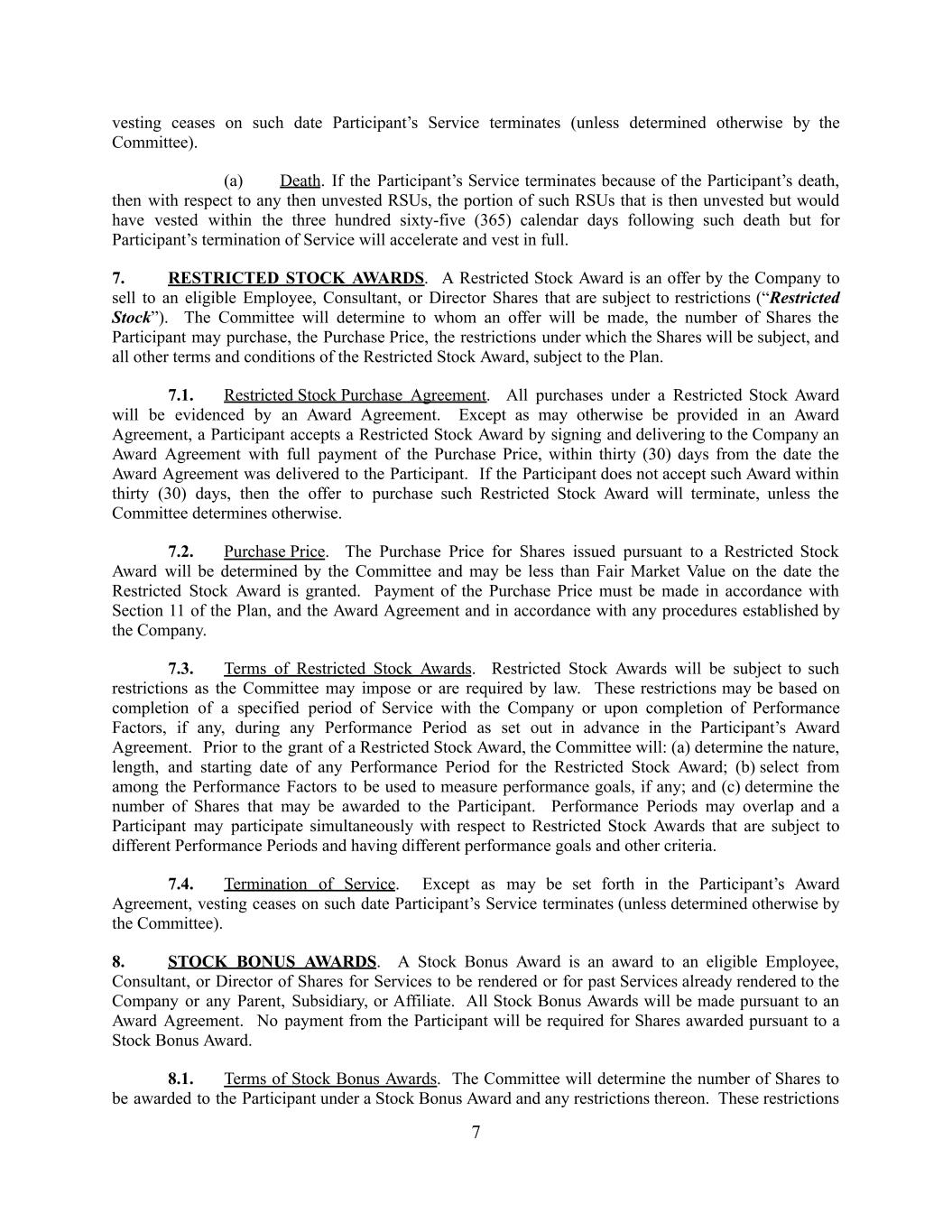 vesting ceases on such date Participant’s Service terminates (unless determined otherwise by the Committee). (a) Death. If the Participant’s Service terminates because of the Participant’s death, then with respect to any then unvested RSUs, the portion of such RSUs that is then unvested but would have vested within the three hundred sixty-five (365) calendar days following such death but for Participant’s termination of Service will accelerate and vest in full. 7. RESTRICTED STOCK AWARDS. A Restricted Stock Award is an offer by the Company to sell to an eligible Employee, Consultant, or Director Shares that are subject to restrictions (“Restricted Stock”). The Committee will determine to whom an offer will be made, the number of Shares the Participant may purchase, the Purchase Price, the restrictions under which the Shares will be subject, and all other terms and conditions of the Restricted Stock Award, subject to the Plan. 7.1. Restricted Stock Purchase Agreement. All purchases under a Restricted Stock Award will be evidenced by an Award Agreement. Except as may otherwise be provided in an Award Agreement, a Participant accepts a Restricted Stock Award by signing and delivering to the Company an Award Agreement with full payment of the Purchase Price, within thirty (30) days from the date the Award Agreement was delivered to the Participant. If the Participant does not accept such Award within thirty (30) days, then the offer to purchase such Restricted Stock Award will terminate, unless the Committee determines otherwise. 7.2. Purchase Price. The Purchase Price for Shares issued pursuant to a Restricted Stock Award will be determined by the Committee and may be less than Fair Market Value on the date the Restricted Stock Award is granted. Payment of the Purchase Price must be made in accordance with Section 11 of the Plan, and the Award Agreement and in accordance with any procedures established by the Company. 7.3. Terms of Restricted Stock Awards. Restricted Stock Awards will be subject to such restrictions as the Committee may impose or are required by law. These restrictions may be based on completion of a specified period of Service with the Company or upon completion of Performance Factors, if any, during any Performance Period as set out in advance in the Participant’s Award Agreement. Prior to the grant of a Restricted Stock Award, the Committee will: (a) determine the nature, length, and starting date of any Performance Period for the Restricted Stock Award; (b) select from among the Performance Factors to be used to measure performance goals, if any; and (c) determine the number of Shares that may be awarded to the Participant. Performance Periods may overlap and a Participant may participate simultaneously with respect to Restricted Stock Awards that are subject to different Performance Periods and having different performance goals and other criteria. 7.4. Termination of Service. Except as may be set forth in the Participant’s Award Agreement, vesting ceases on such date Participant’s Service terminates (unless determined otherwise by the Committee). 8. STOCK BONUS AWARDS. A Stock Bonus Award is an award to an eligible Employee, Consultant, or Director of Shares for Services to be rendered or for past Services already rendered to the Company or any Parent, Subsidiary, or Affiliate. All Stock Bonus Awards will be made pursuant to an Award Agreement. No payment from the Participant will be required for Shares awarded pursuant to a Stock Bonus Award. 8.1. Terms of Stock Bonus Awards. The Committee will determine the number of Shares to be awarded to the Participant under a Stock Bonus Award and any restrictions thereon. These restrictions 7
