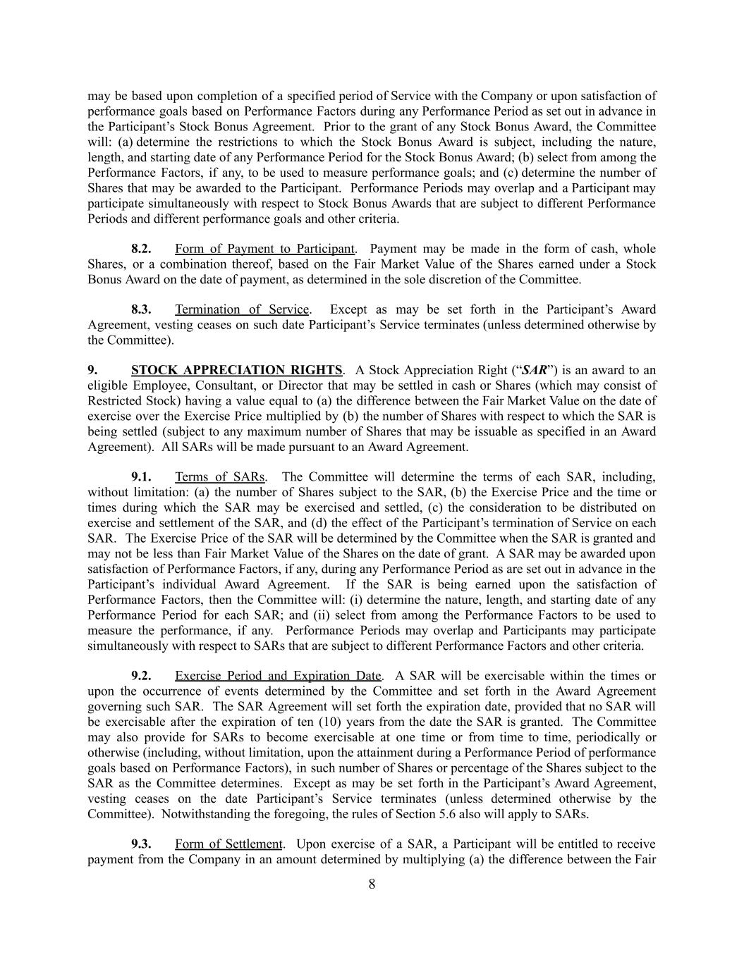 may be based upon completion of a specified period of Service with the Company or upon satisfaction of performance goals based on Performance Factors during any Performance Period as set out in advance in the Participant’s Stock Bonus Agreement. Prior to the grant of any Stock Bonus Award, the Committee will: (a) determine the restrictions to which the Stock Bonus Award is subject, including the nature, length, and starting date of any Performance Period for the Stock Bonus Award; (b) select from among the Performance Factors, if any, to be used to measure performance goals; and (c) determine the number of Shares that may be awarded to the Participant. Performance Periods may overlap and a Participant may participate simultaneously with respect to Stock Bonus Awards that are subject to different Performance Periods and different performance goals and other criteria. 8.2. Form of Payment to Participant. Payment may be made in the form of cash, whole Shares, or a combination thereof, based on the Fair Market Value of the Shares earned under a Stock Bonus Award on the date of payment, as determined in the sole discretion of the Committee. 8.3. Termination of Service. Except as may be set forth in the Participant’s Award Agreement, vesting ceases on such date Participant’s Service terminates (unless determined otherwise by the Committee). 9. STOCK APPRECIATION RIGHTS. A Stock Appreciation Right (“SAR”) is an award to an eligible Employee, Consultant, or Director that may be settled in cash or Shares (which may consist of Restricted Stock) having a value equal to (a) the difference between the Fair Market Value on the date of exercise over the Exercise Price multiplied by (b) the number of Shares with respect to which the SAR is being settled (subject to any maximum number of Shares that may be issuable as specified in an Award Agreement). All SARs will be made pursuant to an Award Agreement. 9.1. Terms of SARs. The Committee will determine the terms of each SAR, including, without limitation: (a) the number of Shares subject to the SAR, (b) the Exercise Price and the time or times during which the SAR may be exercised and settled, (c) the consideration to be distributed on exercise and settlement of the SAR, and (d) the effect of the Participant’s termination of Service on each SAR. The Exercise Price of the SAR will be determined by the Committee when the SAR is granted and may not be less than Fair Market Value of the Shares on the date of grant. A SAR may be awarded upon satisfaction of Performance Factors, if any, during any Performance Period as are set out in advance in the Participant’s individual Award Agreement. If the SAR is being earned upon the satisfaction of Performance Factors, then the Committee will: (i) determine the nature, length, and starting date of any Performance Period for each SAR; and (ii) select from among the Performance Factors to be used to measure the performance, if any. Performance Periods may overlap and Participants may participate simultaneously with respect to SARs that are subject to different Performance Factors and other criteria. 9.2. Exercise Period and Expiration Date. A SAR will be exercisable within the times or upon the occurrence of events determined by the Committee and set forth in the Award Agreement governing such SAR. The SAR Agreement will set forth the expiration date, provided that no SAR will be exercisable after the expiration of ten (10) years from the date the SAR is granted. The Committee may also provide for SARs to become exercisable at one time or from time to time, periodically or otherwise (including, without limitation, upon the attainment during a Performance Period of performance goals based on Performance Factors), in such number of Shares or percentage of the Shares subject to the SAR as the Committee determines. Except as may be set forth in the Participant’s Award Agreement, vesting ceases on the date Participant’s Service terminates (unless determined otherwise by the Committee). Notwithstanding the foregoing, the rules of Section 5.6 also will apply to SARs. 9.3. Form of Settlement. Upon exercise of a SAR, a Participant will be entitled to receive payment from the Company in an amount determined by multiplying (a) the difference between the Fair 8